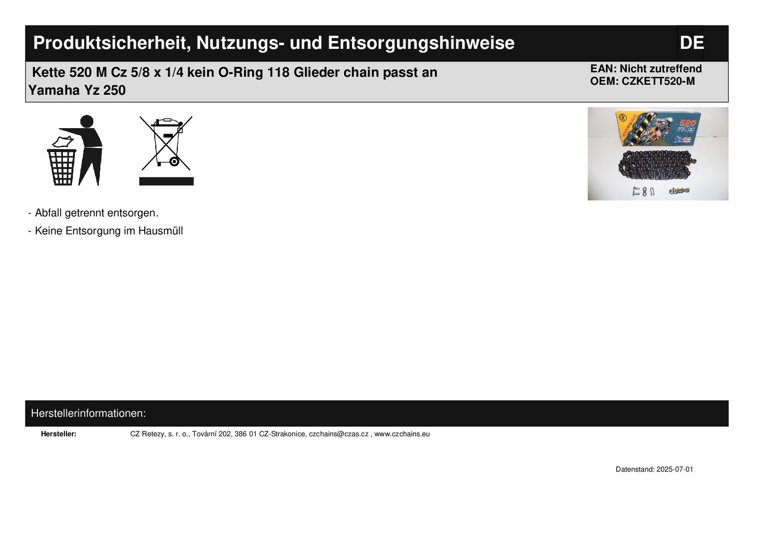 In dieser Auktion gibt es folgenden Artikel zu kaufen: hochwertige Kette (siehe Foto) keine X- oder O-Ring-Kette! Typ: 520 M (5/8 x 1/4) Gliederzahl: 118 Lieferumfang: Kette offen mit Kettenschloss Artikelzustand: neu Bei Unklarheiten oder Fragen bitte erst E-Mail schreiben.