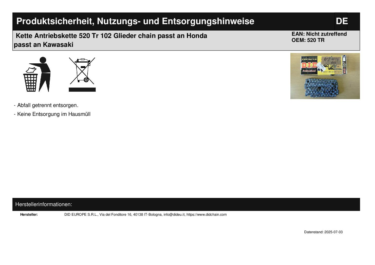 In dieser Auktion gibt es folgenden Artikel zu kaufen: Kette (siehe Foto) Typ: 520 TR Gliederzahl: 102 Lieferumfang: Kette, offen ohne Kettenschloss Artikelzustand: neu aus Geschäftsauflösung, Verpackung kann beschädigt sein; Zustand siehe Foto Bei Unklarheiten oder Fragen bitte erst E-Mail schreiben.