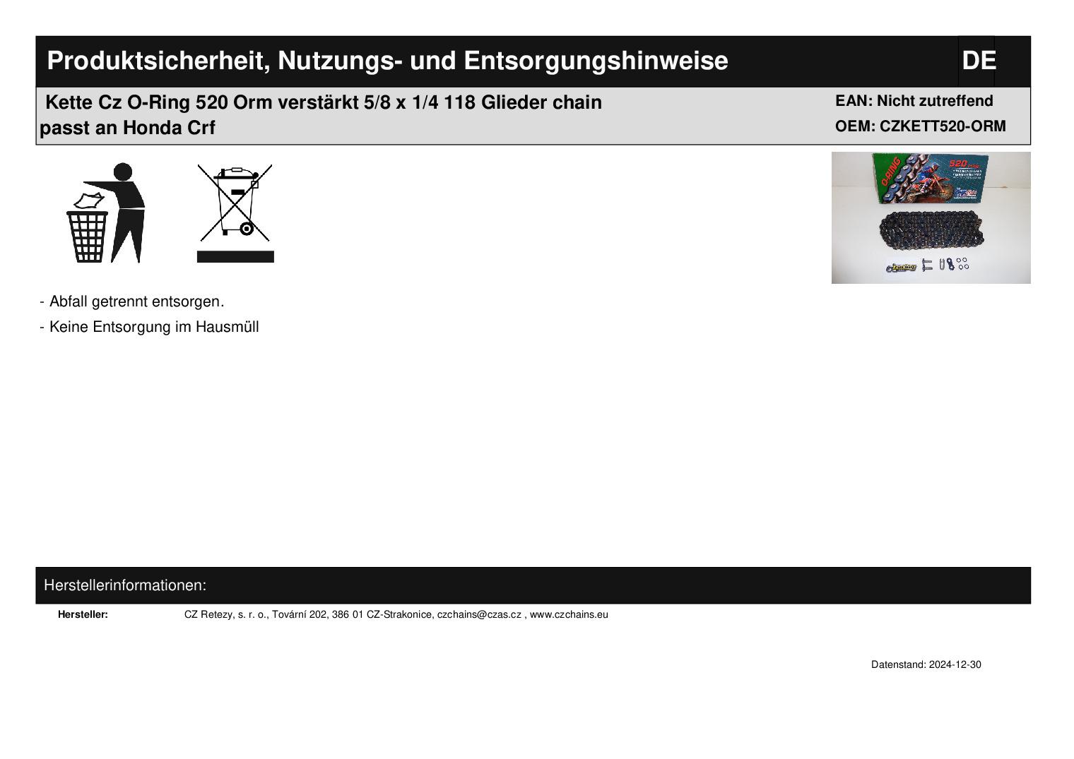In dieser Auktion gibt es folgenden Artikel zu kaufen: verstärkte O-Ring Kette (siehe Foto) Hersteller: CZ-Chains Typ: 520 ORM (5/8 x 1/4) Gliederzahl: 118 Lieferumfang: Kette, offen mit Kettenschloss Artikelzustand: neu Bei Unklarheiten oder Fragen bitte erst E-Mail schreiben.