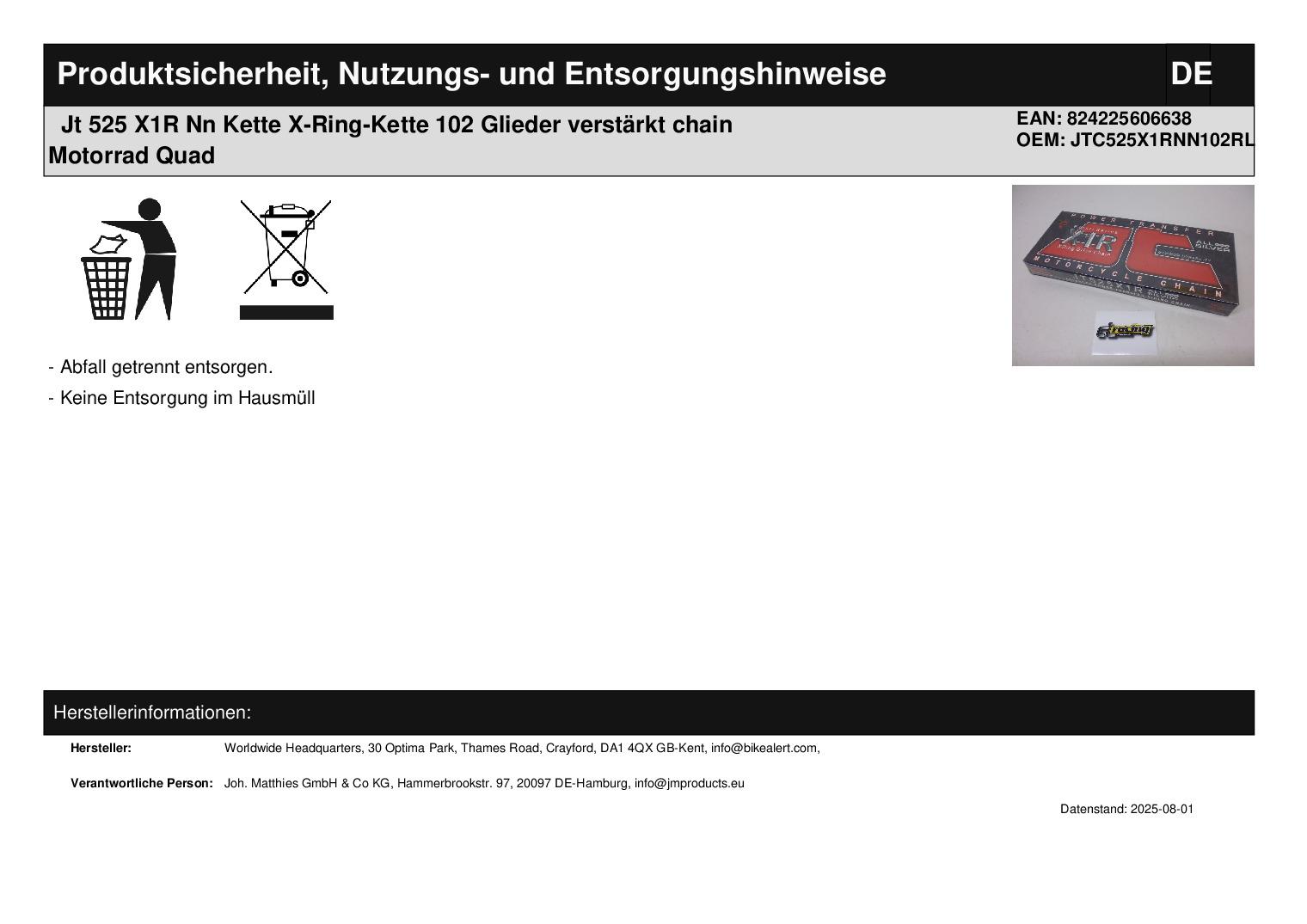 In dieser Auktion gibt es folgenden Artikel zu kaufen: verstärkte X-Ring-Kette (siehe Foto) Typ: 525 X1R Bitte Kettentyp vergleichen! Gliederzahl: 102 Lieferumfang: Kette offen, mit Nietschloss Artikelzustand: neu