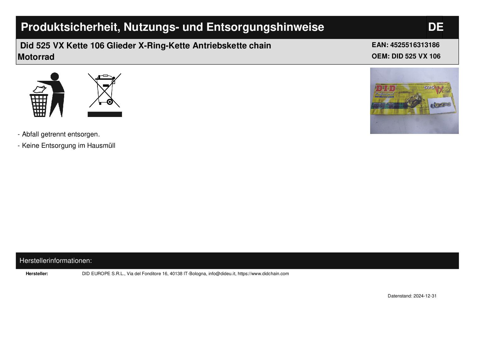 In dieser Auktion gibt es folgenden Artikel zu kaufen: Kette (ähnlich Foto) Typ: DID 525 VX Bitte Kettentyp vergleichen! Gliederzahl: 106 Lieferumfang: Kette offen, mit Hohlnietschloss Artikelzustand: neu