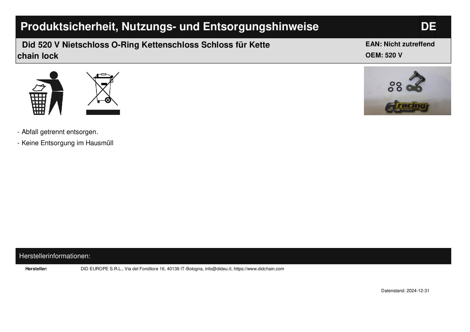 In dieser Auktion gibt es folgenden Artikel zu kaufen: O-Ring-Nietschloss (siehe Foto) Typ: 520 V Bitte Kettentyp vergleichen! Lieferumfang: 1 Stück Artikelzustand: neu aus Geschäftsauflösung, mit minimalen Lagerspuren; Zustand siehe Foto