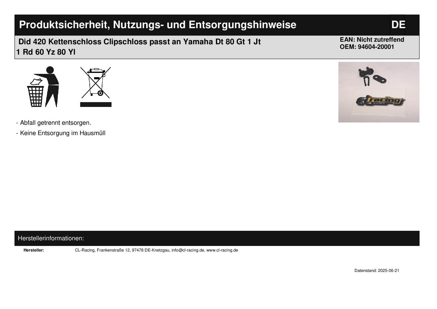 In dieser Auktion gibt es folgenden Artikel zu kaufen: Kettenschloss DID 420 (siehe Foto) Modell: passend für Yamaha DT80, GT1, GT80, GTMX, HS1, JT1, LB50, LB80, MX80, RD60, RX50K, TY80, U7E, YG1, YJ1, YJ2, YL1, YL2, YZ50G, YZ60, YZ80 Baujahr: 1974 - 1976 Lieferumfang: siehe Foto Artikelzustand: neu aus Geschäftsauflösung, mit leichten Lagerspuren ; Zustand siehe Foto Bei Unklarheiten oder Fragen bitte erst E-Mail schreiben.