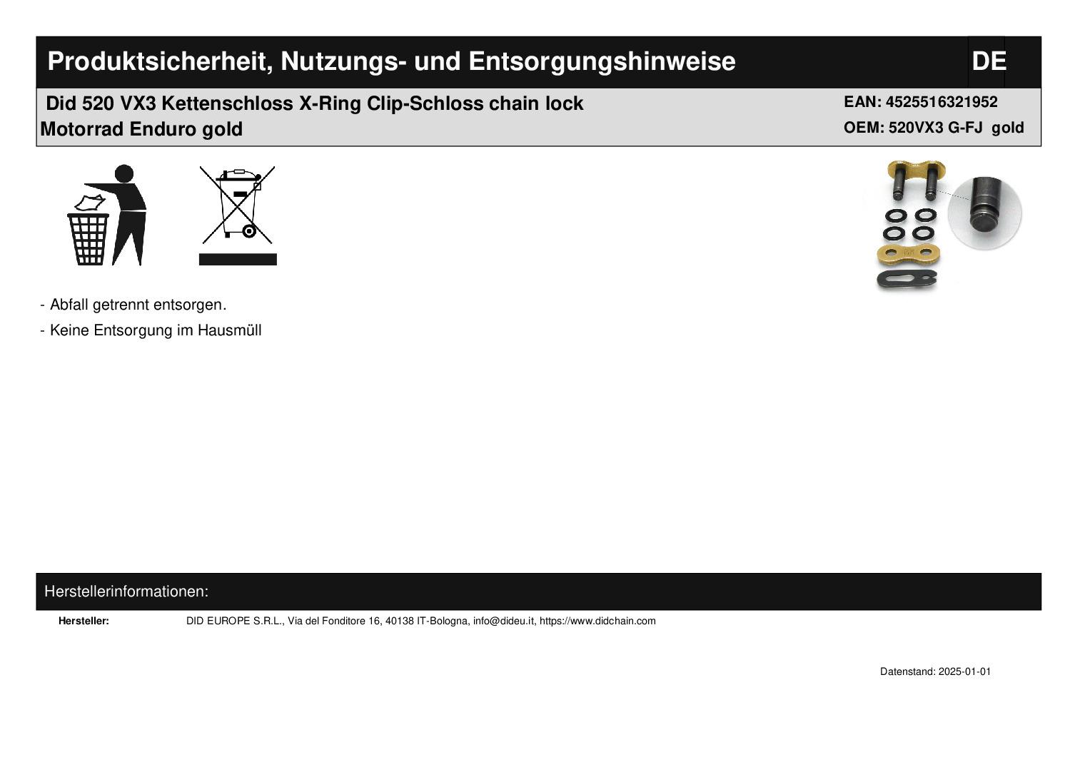 Titel: Did 520 VX3 Kettenschloss X-Ring Clip-Schloss chain lock Motorrad Enduro gold