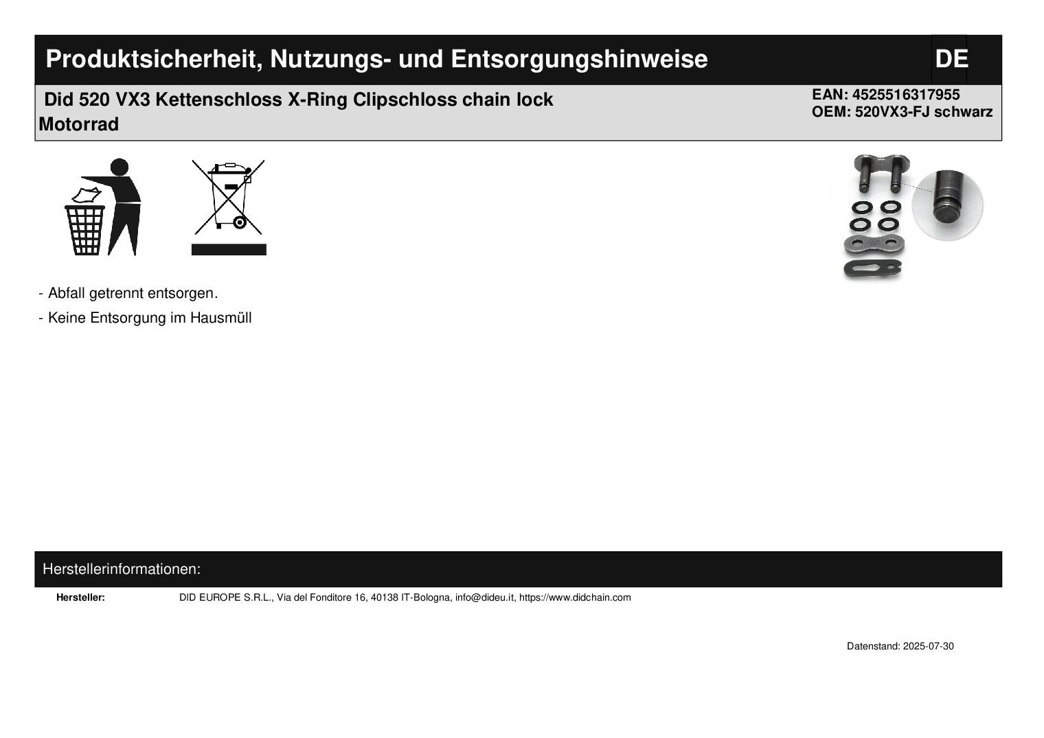 In dieser Auktion gibt es folgenden Artikel zu kaufen: Kettenschloss (ähnlich Foto) Typ: 520 VX3 Bitte Kettentyp vergleichen! Lieferumfang: siehe Foto Artikelzustand: neu