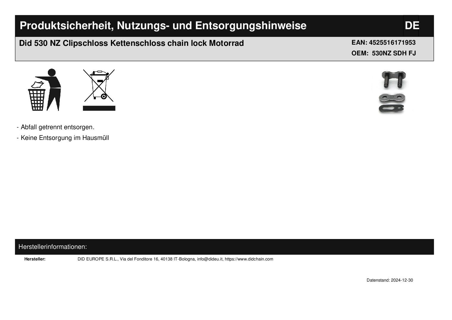 In dieser Auktion gibt es folgenden Artikel zu kaufen: Kettenschloss (siehe Foto) Typ: 530 NZ Bitte Kettentyp vergleichen! Lieferumfang: siehe Foto Artikelzustand: neu