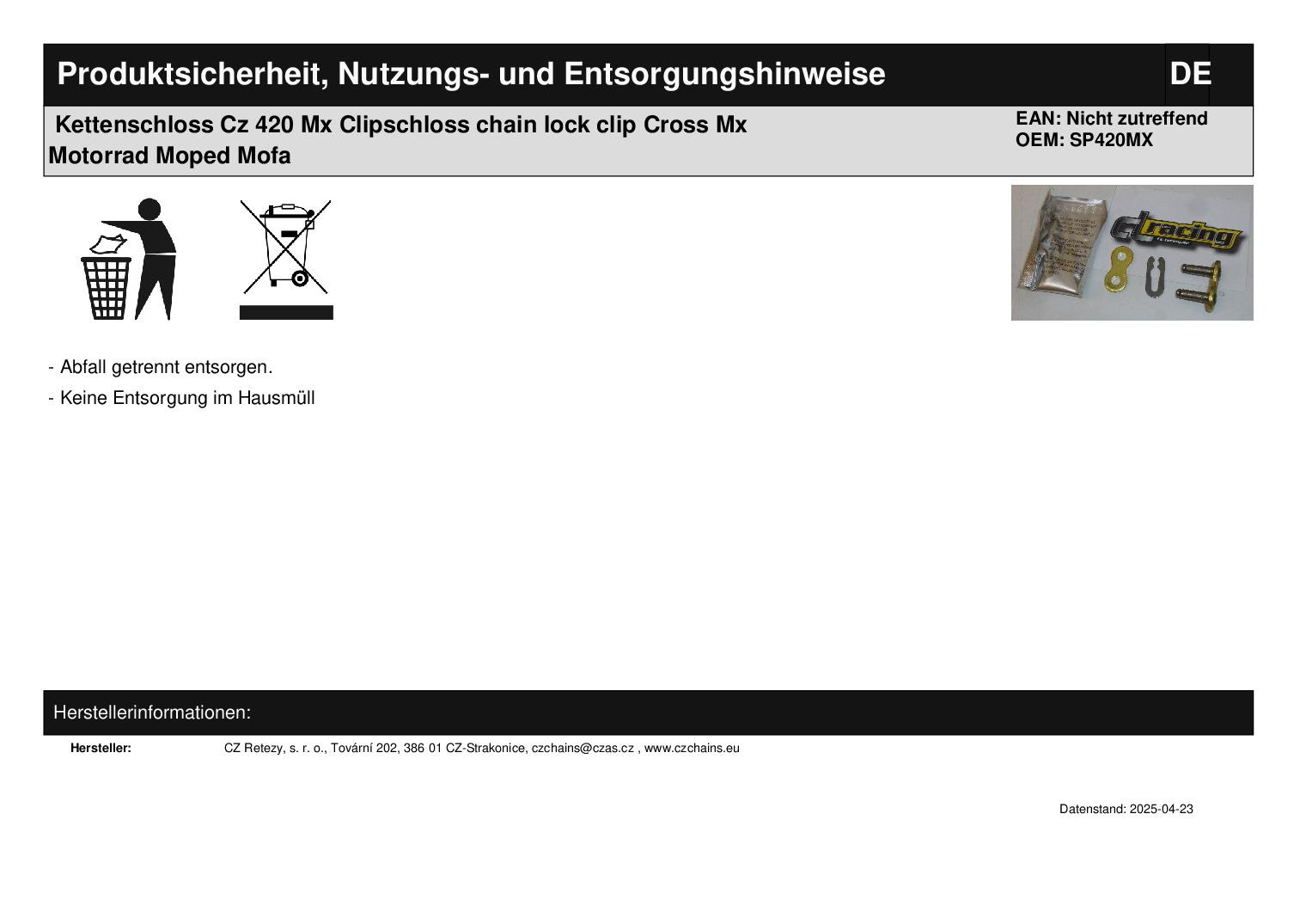 In dieser Auktion gibt es folgenden Artikel zu kaufen: Clipschloss (siehe Foto) passend nur für folgenden Kettentyp: CZ 420 MX Bitte Kettentyp vergleichen! Lieferumfang: 1 Stück Artikelzustand: neu Bei Unklarheiten oder Fragen bitte erst E-Mail schreiben.