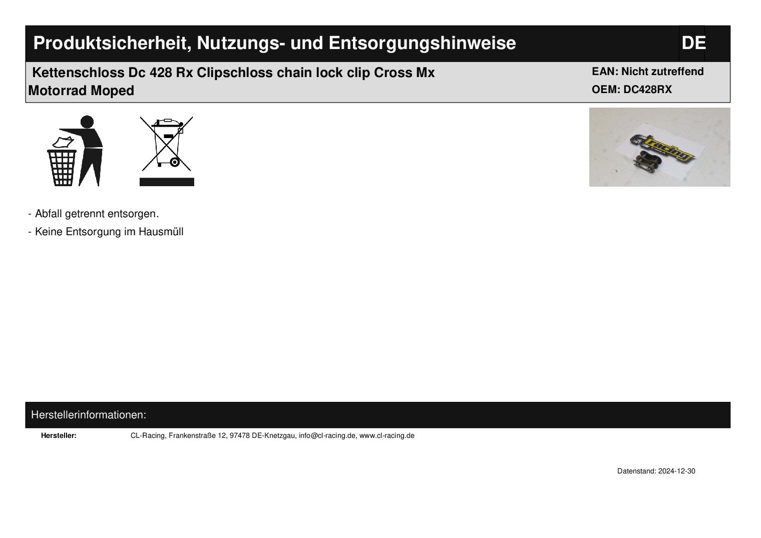 In dieser Auktion gibt es folgenden Artikel zu kaufen: Clipschloss (siehe Foto) Hersteller: DC Dyna chains Typ: DC 428 RX Bitte Kettentyp vergleichen! Lieferumfang: siehe Foto Artikelzustand: neu aus Geschäftsauflösung, mit minimalen Lagerspuren; Zustand siehe Foto
