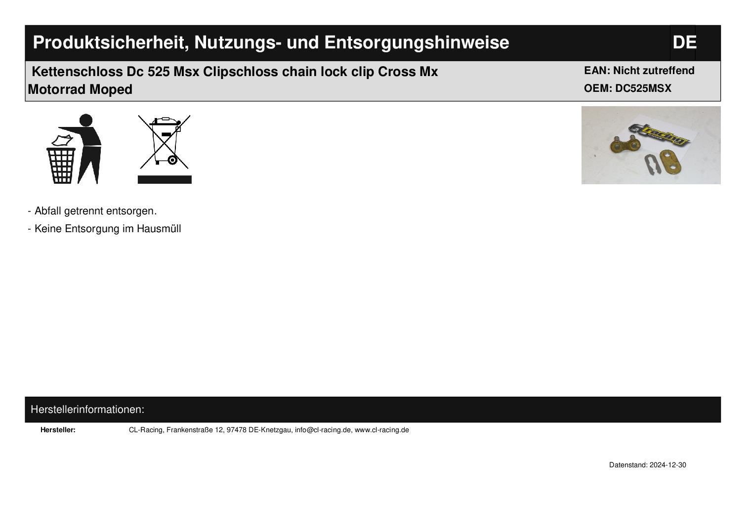 In dieser Auktion gibt es folgenden Artikel zu kaufen: Clipschloss (siehe Foto) Hersteller: DC Dyna chains Typ: DC 525 MSX Bitte Kettentyp vergleichen! Lieferumfang: siehe Foto Artikelzustand: neu aus Geschäftsauflösung, mit minimalen Lagerspuren; Zustand siehe Foto