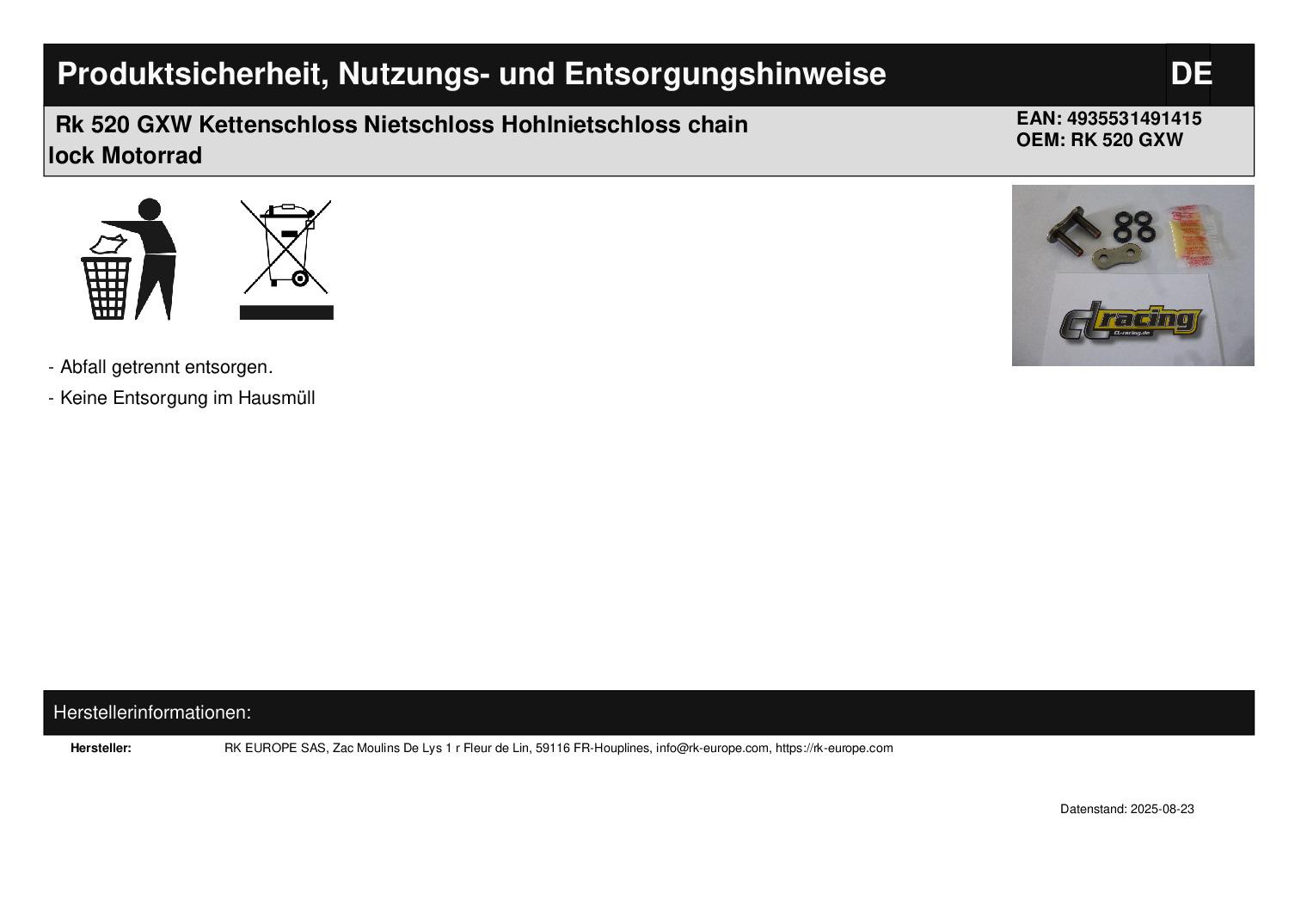 Titel: Rk 520 GXW Kettenschloss Nietschloss Hohlnietschloss chain lock Motorrad