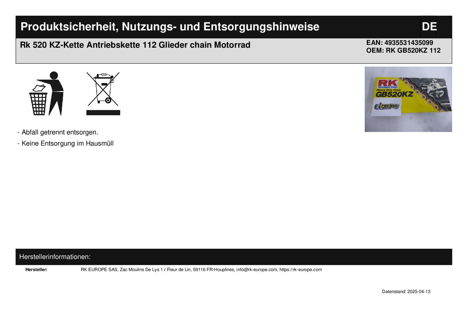 In dieser Auktion gibt es folgenden Artikel zu kaufen: Kette (ähnlich Foto) Typ: RK 520 KZ Bitte Kettentyp vergleichen! Gliederzahl: 112 Lieferumfang: Kette offen, mit Kettenschloss Artikelzustand: neu