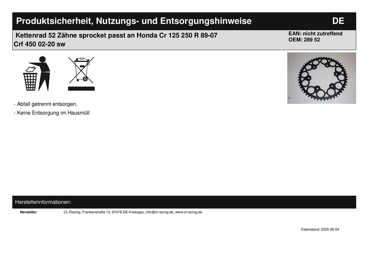 In dieser Auktion gibt es folgenden Artikel zu kaufen: Qualitäts-Kettenrad (siehe Foto) Modell: passend für Honda Cr 125 R Bj.: 1988 - 2007 (2-Takt) Cr 250 R Bj.: 1989 - 2007 (2-Takt) Cr 500 R Bj.: 1988 - 2001 (2-Takt) Crf 150 Bj.: 2003 - 2016 (4-Takt) Crf 230 Bj.: 2003 - 2009 (4-Takt) Crf 250 Bj.: 2004 - 2020 (4-Takt) Crf 450 Bj.: 2002 - 2020 (4-Takt) Xr 250 R Bj.: 1990 - 2004 (4-Takt) Xr 400 R Bj.: 1996 - 2002 (4-Takt) Xr 400 R Bj.: 2000 - 2007 (4-Takt) passend für HM-Moto Cre 490 X Bj.: 2007 - 2008 Cre-f 290 Bj.: 2007 - 2008 Cre 500 X Bj.: 2008 - 2010 Cre-f 250 Bj.: 2005 - 2013 Cre-f 300 Bj.: 2008 - 2010 Cre-f 450 Bj.: 2005 - 2013 Cre-f 500 Bj.: 2011 - 2013 Crm 490 Bj.: 2007 - 2008 Crm 500 Bj.: 2009 - 2010 Crm-f 450 Bj.: 2005 - 2013 Details: Zähnezahl: 52 Teilung: 520 Lochkreis Durchmesser: 153 mm Innendurchmesser: 125 mm Löcher: 6 Vor dem Kauf bitte Übersetzung mit Ihrem Fahrzeug vergleichen! Lieferumfang: 1 Stück Artikelzustand: neu