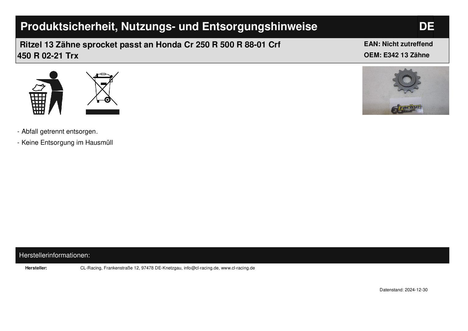 Titel: Ritzel 13 Zähne sprocket passt an Honda Cr 250 R 500 R 88-01 Crf 450 R 02-21 Trx