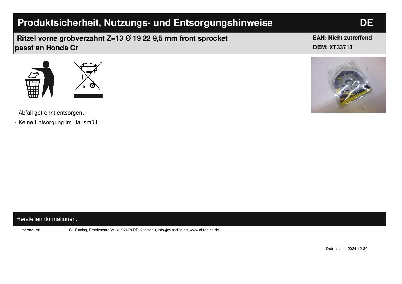 In dieser Auktion gibt es folgenden Artikel zu kaufen: Ritzel (siehe Foto) Modell: passend für Honda CR 250 R Bj.: 81 - 85 CR 450 R Bj.: 81 CR 480 R Bj.: 82 - 83 CR 500 R Bj.: 84 - 85 Abmaße: Innendurchmesser min.: 19 mm Innendurchmesser max.: 22 mm Dicke: 9,5 mm Lochabstand: 36 mm Innenverzahnung: 6 Zähne Teilung: 520 Anzahl der Bohrungen: 2 Bitte Abmaße vergleichen!!! Zähnezahl: 13 Vor dem Kauf bitte Übersetzung mit Ihrem Fahrzeug vergleichen!Lieferumfang: 1 Stück Artikelzustand: neu aus Geschäftsauflösung, mit leichten Lagerspuren; Zustand siehe Foto Weitere Ritzel auf Anfrage! Bei Unklarheiten oder Fragen bitte erst E-Mail schreiben.