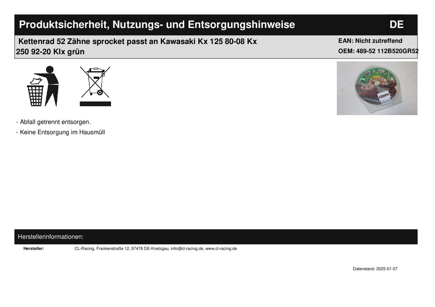 In dieser Auktion gibt es folgenden Artikel zu kaufen: Kettenrad (siehe Foto) Modell: passend für Kawasaki Kx 125 A Bj.: 1980 - 1981 (2-Takt) Kx 125 A Bj.: 1982 - 1983 (2-Takt) Kx 250 C Bj.: 1983 - 1984 (2-Takt)Kx 125 C Bj.: 1984 (2-Takt) Kx 125 D Bj.: 1985 (2-Takt) Kx 125 E Bj.: 1986 - 1987 (2-Takt) Kx 125 F Bj.: 1988 (2-Takt) Kx 125 G Bj.: 1989 (2-Takt) Kx 125 H Bj.: 1990 - 1991 (2-Takt) Kx 125 J Bj.: 1992 - 1993 (2-Takt) Kx 125 K Bj.: 1994 - 1998 (2-Takt) Kx 125 L Bj.: 1999 - 2002 (2-Takt) Kx 125 M Bj.: 2003 - 2008 (2-Takt) Kx 250 B Bj.: 1982 (2-Takt) Kx 250 D Bj.: 1985 - 1986 (2-Takt) Kx 250 E Bj.: 1987 Kx 250 F Bj.: 1988 (2-Takt) Kx 250 G Bj.: 1989 (2-Takt) Kx 250 H Bj.: 1990 - 1991 (2-Takt) Kx 250 J Bj.: 1992 - 1993 (2-Takt) Kx 250 K Bj.: 1994 - 1998 (2-Takt) Kx 250 L Bj.: 1999 - 2002 (2-Takt) Kx 250 M Bj.: 2003 - 2004 (2-Takt) Kx 250 R Bj.: 2005 - 2008 (2-Takt) Kxf 250 Bj.: 2004 - 2020 (4-Takt) Kxf 450 Bj.: 2006 - 2020 (4-Takt) Kx 500 A Bj.: 1983 - 1984 (2-Takt) Kx 500 B Bj.: 1985 - 1986 (2-Takt) Kx 500 C Bj.: 1987 (2-Takt) Kx 500 D Bj.: 1988 (2-Takt) Kx 500 E Bj.: 1989 - 2003 (2-Takt) Klx 250 R Bj.: 1994 - 1997 (4-Takt) Klx 250 S Bj.: 2009 - 2017 (4-Takt) Klx 300 R Bj.: 1997 - 2003 (4-Takt) Klx 450 R Bj.: 2007 - 2020 (4-Takt) Klx 650 R Bj.: 1993 - 1995, 1999 - 2001 (4-Takt)passend für Suzuki Rmz 250 Bj.: Bj.: 2004 - 2006 (4-Takt) Details: Zähnezahl: 52 Teilung: 520 Lochkreis Durchmesser: 150 mm Innendurchmesser: 134 mm Löcher: 6 Vor dem Kauf bitte Übersetzung mit Ihrem Fahrzeug vergleichen! Lieferumfang: 1 Stück Artikelzustand: neu Bei Unklarheiten oder Fragen bitte erst E-Mail schreiben.