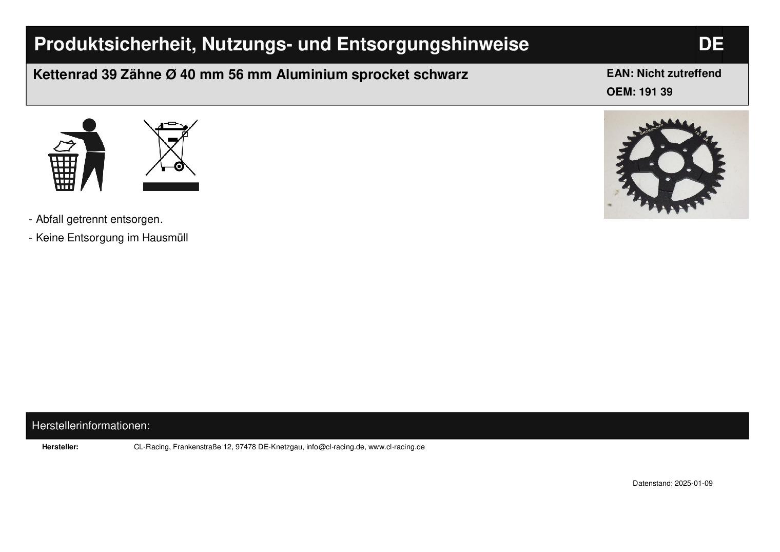 In dieser Auktion gibt es folgenden Artikel zu kaufen: Qualitäts-Kettenrad (siehe Foto) Modell: unbekannt Bj.: unbekannt Abmaße: Zähnezahl: 39 Innendurchmesser: ca. 40 mm Lochkreis: ca. 56 mm (Mitte Bohrung) Bohrung: ca. 7 mm Durchmesser Anzahl der Bohrungen: 5 Vor dem Kauf bitte Übersetzung mit Ihrem Fahrzeug vergleichen! Lieferumfang: 1 Stück Artikelzustand: neu aus Geschäftsauflösung, mit leichten Lagerspuren; Zustand siehe Foto Bei Unklarheiten oder Fragen bitte erst E-Mail schreiben.