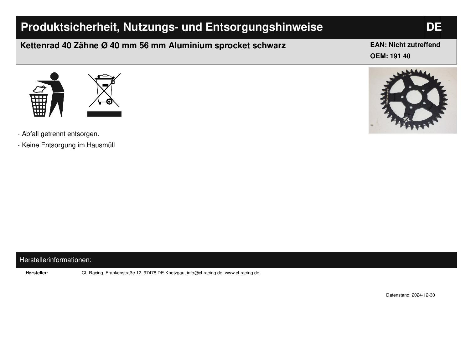 In dieser Auktion gibt es folgenden Artikel zu kaufen: Qualitäts-Kettenrad (siehe Foto) Modell: unbekannt Bj.: unbekannt Zä hnezahl: 40 Abmaße: Innendurchmesser: ca. 40 mm Lochkreis: ca. 56 mm (Mitte Bohrung) Bohrung: ca. 7 mm Durchmesser Anzahl der Bohrungen: 5 Vor dem Kauf bitte Übersetzung mit Ihrem Fahrzeug vergleichen! Lieferumfang: 1 Stück Artikelzustand: neu aus Geschäftsauflösung, mit leichten Lagerspuren; Zustand siehe Foto Bei Unklarheiten oder Fragen bitte erst E-Mail schreiben.