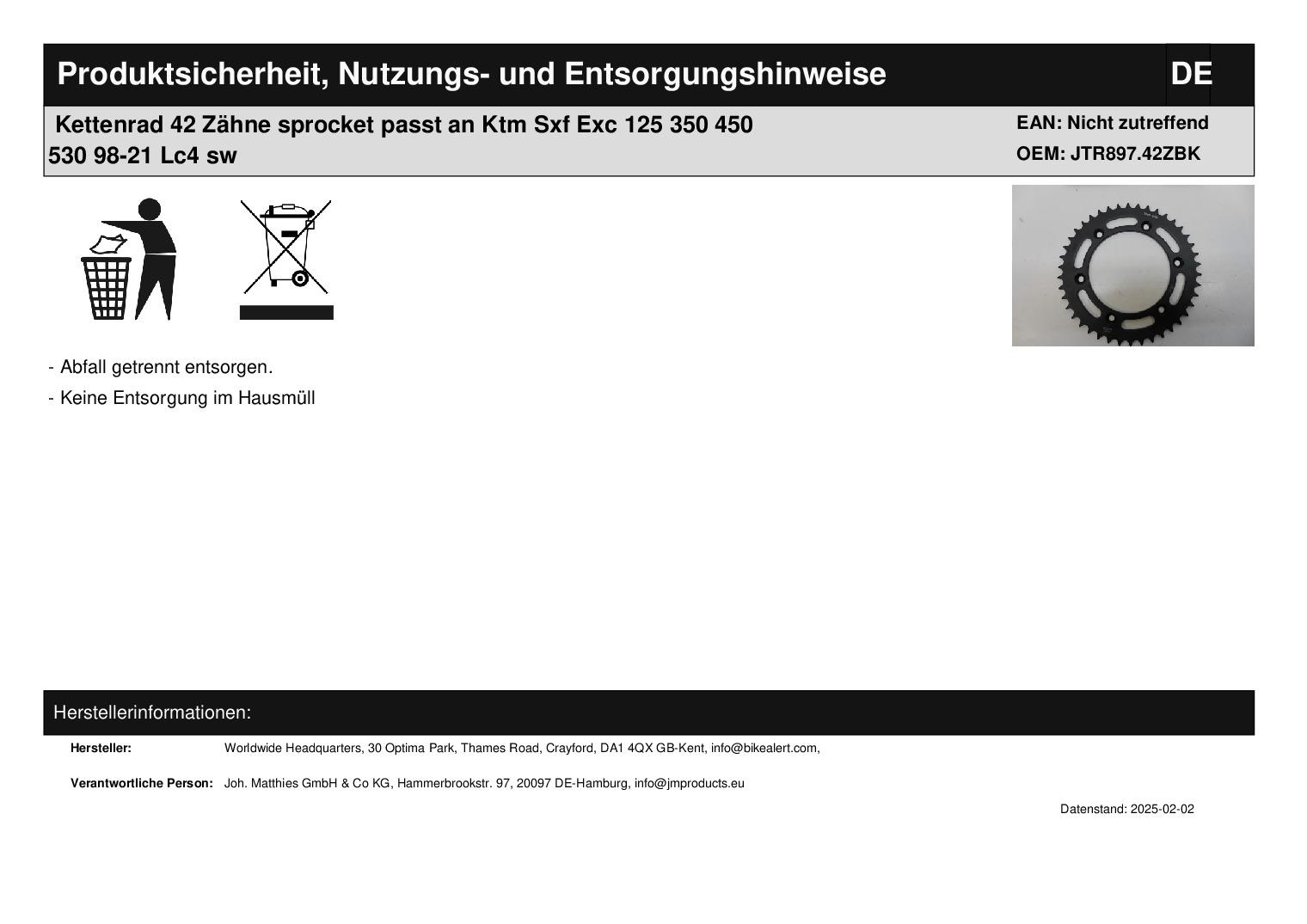 In dieser Auktion gibt es folgenden Artikel zu kaufen: Qualitäts-Kettenrad (siehe Foto) Fahrzeug: passend für Ktm Sx-, Sxf-, Exc-Modelle Bj.: 1998 - 2021 Lc4-Modelle Bj.: 1995 - 2012 Zähne: 42 Teilung: 520 Vor dem Kauf bitte Übersetzung mit Ihrem Fahrzeug vergleichen! Lieferumfang: 1 Stück Artikelzustand: neu Es handelt sich hierbei um kein Originalteil Bei Unklarheiten oder Fragen bitte erst E-Mail schreiben.