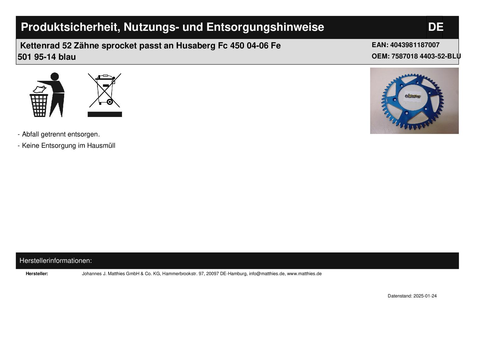 In dieser Auktion gibt es folgenden Artikel zu kaufen: Kettenrad (siehe Foto, jedoch mit 52 Zähnen) Modell: passend für Husaberg FC 450 Bj.: 2004 - 2006 FC 470 Bj.: 2001 - 2002 FC 501 Bj.: 2000 FC 550 Bj.: 2001 - 2006 FC 600 Bj.: 2000 FE 250 i.e. Bj.: 2013 - 2014 FE 350 i.e. Bj.: 2013 - 2014 FE 390 i.e. Bj.: 2010 - 2012 FE 400 Bj.: 2000 - 2003 FE 450 Bj.: 2004 - 2014 FE 501 Bj.: 1995 - 2014 FE 550 Bj.: 2004 - 2008 FE 570 Bj.: 2009 - 2012 FE 600 Bj.: 2000 FE 650 Bj.: 2001 - 2008 FS 400 Bj.: 2001 - 2003 FS 450 Bj.: 2004 - 2008 FS 570 Bj.: 2010 - 2011 FS 650 Bj.: 2001 - 2008 FX 450 Bj.: 2010 - 2011 TE 125 Bj.: 2012 - 2014 TE 250 Bj.: 2011 - 2014 TE 300 Bj.: 2011 - 2014 passend für Husqvarna FE 701 Bj.: 2016 FC 250 Bj.: 2014 - 2017 FC 350 Bj.: 2014 - 2017 FC 450 Bj.: 2014 - 2017 FE 250 Bj.: 2014 - 2017 FE 350 Bj.: 2014 - 2017 FE 450 Bj.: 2014 - 2017 FE 501 Bj.: 2014 - 2017 FS 450 Bj.: 2015 - 2017 FS 701 Bj.: 2016 TC 125 Bj.: 2014 - 2017 TC 250 Bj.: 2014 - 2017 TE 125 Bj.: 2014 - 2016 TE 250 Bj.: 2014 - 2017 TE 300 Bj.: 2014 - 2017 TX 125 Bj.: 2017 passend für Ktm Adventure 640 R Bj.: 1999 - 2007 Duke 400 Bj.: 1994 - 1995 Duke 620 Bj.: 1994 - 1998 Duke 690 Bj.: 2008 - 2016 Duke II 640 Bj.: 1999 - 2007 E-GS 600 LC4 Bj.: 1993 EGS 125 2T Bj.: 1993 - 1999 EGS 200 2T Bj.: 1998 - 1999 EGS 250 2T Bj.: 1993 - 1999 EGS 300 2T Bj.: 1993 - 1999 EGS 350 LC4 Bj.: 1993 - 1994 EGS 360 2T Bj.: 1996 - 1997 EGS 380 2T Bj.: 1998 - 1999 EGS 400 LC4 Bj.: 1993 - 1997 EGS 620 LC4 Bj.: 1994 - 1995 EGS-E 400 LC4 Bj.: 1997 Enduro 690 Bj.: 2008 - 2016 EXC 125 2T Bj.: 1993 - 2016 EXC 200 2T Bj.: 1998 - 2016 EXC 250 2T Bj.: 1993 - 2017 EXC 300 2T Bj.: 1993 - 2017 EXC 350 LC4 Bj.: 1993 EXC 360 2T Bj.: 1996 - 1997 EXC 380 2T Bj.: 1998 - 2001 EXC 400 Bj.: 2000 - 2007 EXC 440 Bj.: 1994 - 1995 EXC 450 Bj.: 2008 - 2016 EXC 500 Bj.: 2012 - 2016 EXC 520 Bj.: 2000 - 2001 EXC 520 Bj.: 2002 - 2007 EXC 530 Bj.: 2008 - 2011 EXC 600 Bj.: 1993 EXC 612 Bj.: 1993 EXC 620 Bj.: 1994 - 1997 EXC-E 300 Bj.: 2007 - 2016 EXC-F 250 Bj.: 2007 - 2017 EXC-F 350 Bj.: 2012 - 2017 EXC-F 450 Bj.: 2017 EXC-F 500 Bj.: 2017 EXE 125 Bj.: 2000 LC4-E 640 Bj.: 1998 - 2006 MXC 525 Bj.: 2003 - 2005 Rally Factory Replica 690 Bj.: 2009 - 2010 SC 350 LC4 Bj.: 1994 - 1995 SC 400 LC4 Bj.: 1995 - 1999 SC 620 LC4 Bj.: 1994 - 2002 SMC 625 Bj.: 2004 - 2006 SMC 660 Bj.: 2003 - 2006 SMC 690 Bj.: 2008 - 2016 SMR 450 B j.: 2005 - 2014 SMR 525 Bj.: 2004 - 2005 SMR 560 Bj.: 2006 - 2007 Sting 125 2T Bj.: 1997 - 1998 Supermoto 690 Bj.: 2007 SX 125 2T Bj.: 1993 - 2017 SX 150 2T Bj.: 2009 - 2010 + 2017 passend für Ktm SX 200 2T Bj.: 2003 passend für Ktm SX 200 2T Bj.: 2004 SX 250 2T Bj.: 1993 56PS 41Kw SX 250 2T Bj.: 1994 56PS 41Kw SX 250 2T Bj.: 1995 56PS 41Kw SX 250 2T Bj.: 1996 56PS 41Kw SX 250 2T Bj.: 1997 56PS 41Kw SX 250 2T Bj.: 1998 56PS 41Kw SX 250 2T Bj.: 1999 56PS 41Kw SX 250 2T Bj.: 2000 56PS 41Kw SX 250 2T Bj.: 2001 56PS 41Kw SX 250 2T Bj.: 2002 56PS 41Kw SX 250 2T Bj.: 2003 56PS 41Kw SX 250 2T Bj.: 2004 53PS 39Kw SX 250 2T Bj.: 2005 56PS 41Kw SX 250 2T Bj.: 2006 56PS 41Kw SX 250 2T Bj.: 2007 56PS 41Kw SX 250 2T Bj.: 2008 56PS 41Kw SX 250 2T Bj.: 2009 56PS 41Kw SX 250 2T Bj.: 2010 56PS 41Kw SX 250 2T Bj.: 2011 56PS 41Kw SX 250 2T Bj.: 2012 56PS 41Kw SX 250 2T Bj.: 2013 SX 250 2T Bj.: 2014 SX 250 2T Bj.: 2015 SX 250 2T Bj.: 2016 SX 250 2T Bj.: 2017 SX 300 2T Bj.: 1993 17/52PS 13/38Kw SX 300 2T Bj.: 1994 17/52PS 13/38Kw SX 300 2T Bj.: 1995 17/52PS 13/38Kw SX 360 2T Bj.: 1996 60PS 44Kw SX 360 2T Bj.: 1997 60PS 44Kw SX 380 2T Bj.: 1998 64PS 47Kw SX 380 2T Bj.: 1999 64PS 47Kw SX 380 2T Bj.: 2000 59PS 43Kw SX 380 2T Bj.: 2001 59PS 43Kw SX 380 2T Bj.: 2002 59PS 43Kw SX 400 Bj.: 2000 SX 400 Bj.: 2001 SX 400 Bj.: 2002 SX 440 2T Bj.: 1994 SX 450 Bj.: 2003 54 5PS 40Kw SX 450 Bj.: 2004 54 5PS 40Kw SX 450 Bj.: 2005 54 5PS 40Kw SX 450 Bj.: 2006 54 5PS 40Kw SX 500 2T Bj.: 1992 - 1993 60PS 44Kw SX 500 2T Bj.: 1994 1995 60PS 44Kw SX 520 Bj.: 2000 59PS 43Kw SX 520 Bj.: 2001 59PS 43Kw SX 520 Bj.: 2002 59PS 43Kw SX 525 Bj.: 2003 57PS 42Kw SX 525 Bj.: 2004 57PS 42Kw SX 525 Bj.: 2005 57PS 42Kw SX 525 Bj.: 2006 57PS 42Kw SX 620 LC4 Bj.: 1994 59PS 43Kw SX 620 LC4 Bj.: 1995 60PS 44Kw SX 620 LC4 Bj.: 1996 60PS 44Kw SX 620 LC4 Bj.: 1997 60PS 44Kw SX 620 LC4 Bj.: 1998 60PS 44Kw SX 620 LC4 Bj.: 1999 60PS 44Kw SX-F 250 4T Bj.: 2006 39PS 29Kw SX-F 250 4T Bj.: 2007 39PS 29Kw SX-F 250 4T Bj.: 2008 39PS 29Kw SX-F 250 4T Bj.: 2009 39PS 29Kw SX-F 250 4T Bj.: 2010 39PS 29Kw SX-F 250 i.e.4T Bj.: 2011 39PS 29Kw SX-F 250 i.e.4T Bj.: 2012 39PS 29Kw SX-F 250 i.e.4T Bj.: 2013 SX-F 250 i.e.4T Bj.: 2014 SX-F 250 i.e.4T Bj.: 2015 SX-F 250 i.e.4T Bj.: 2016 SX-F 250 i.e.4T Bj.: 2017 SX-F 250 i.e.4T Bj.: 2017 SX-F 350 i.e 4T Bj.: 2011 48PS 35Kw SX-F 350 i.e 4T Bj.: 2012 48PS 35Kw SX-F 350 i.e 4 Bj.: T 2013 SX-F 350 i.e 4T Bj.: 2014 SX-F 350 i.e 4T Bj.: 2015 SX-F 350 i.e 4T Bj.: 2016 SX-F 350 i.e 4T Bj.: 2017 SX-F 450 i.e. Bj.: 2013 SX-F 450 i.e. Bj.: 2014 SX-F 450 i.e. Bj.: 2015 SX-F 450 i.e. Bj.: 2016 SX-F 450 i.e. Bj.: 2017 SX-F 450 i.e. Bj.: 2017 SX-F 450 Bj.: 2007 53PS 39Kw SX-F 450 Bj.: 2008 53PS 39Kw SX-F 450 Bj.: 2009 53PS 39Kw SX-F 450 Bj.: 2010 53PS 39Kw SX-F 450 Bj.: 2011 53PS 39Kw SX-F 450 Bj.: 2012 53PS 39Kw SX-F 505 Bj.: 2007 SX-F 505 Bj.: 2008 SXC 400 Bj.: 1997 SXC 400 Bj.: 1998 SXC 400 Bj.: 1999 SXC 540 Bj.: 1998 SXC 540 Bj.: 1999 SXC 620 LC4 Bj.: 1997 SXC 625 Bj.: 2003 32 5PS 24Kw SXC 625 Bj.: 2004 32 5PS 24Kw SXC 625 Bj.: 2005 29PS 21Kw SXC 625 Bj.: 2006 29PS 21Kw XC 525 Bj.: 2006 61PS 45Kw XC 525 Bj.: 2007 61PS 45Kw XC-W 125 2T Bj.: 2017 XC-W 150 2T Bj.: 2017 Abmaße: Innendurchmesser: ca. 125 mm Lochkreis: ca. 150 mm (Mitte Bohrung) Bohrung: ca. 8 mm Durchmesser Anzahl der Bohrungen: 6 Teilung: 520 Vor dem Kauf bitte Übersetzung mit Ihrem Fahrzeug vergleichen! Zähnezahl: 52 Lieferumfang: 1 Stück Artikelzustand: neu Es handelt sich hierbei um kein Originalteil Bei Unklarheiten oder Fragen bitte erst E-Mail schreiben.