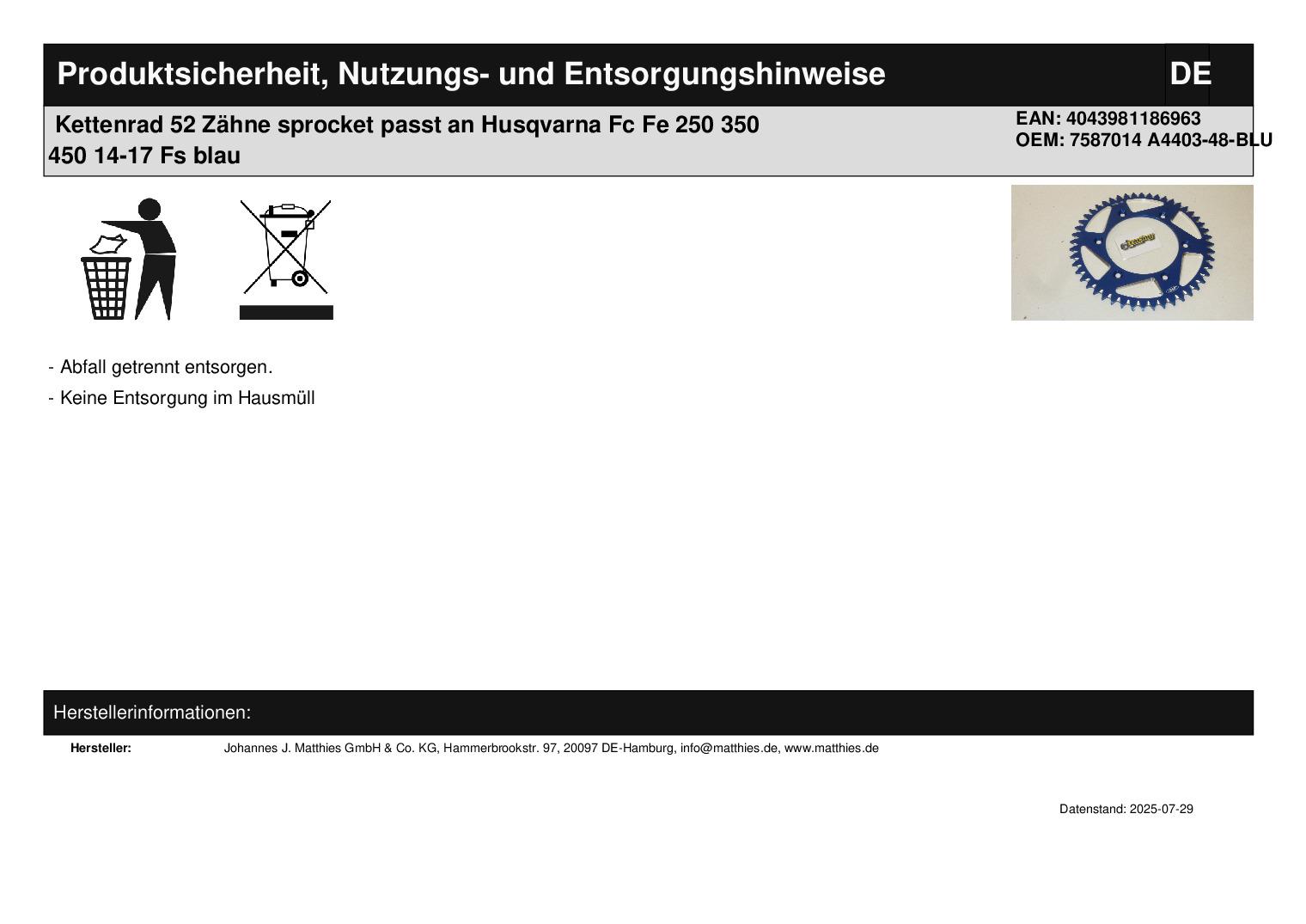 In dieser Auktion gibt es folgenden Artikel zu kaufen: Kettenrad (siehe Foto) Modell: passend für Husaberg FC 450 Bj.: 2004 - 2006 FC 470 Bj.: 2001 - 2002 FC 501 Bj.: 2000 FC 550 Bj.: 2001 - 2006 FC 600 Bj.: 2000 FE 250 i.e. Bj.: 2013 - 2014 FE 350 i.e. Bj.: 2013 - 2014 FE 390 i.e. Bj.: 2010 - 2012 FE 400 Bj.: 2000 - 2003 FE 450 Bj.: 2004 - 2014 FE 501 Bj.: 1995 - 2014 FE 550 Bj.: 2004 - 2008 FE 570 Bj.: 2009 - 2012 FE 600 Bj.: 2000 FE 650 Bj.: 2001 - 2008 FS 400 Bj.: 2001 - 2003 FS 450 Bj.: 2004 - 2008 FS 570 Bj.: 2010 - 2011 FS 650 Bj.: 2001 - 2008 FX 450 Bj.: 2010 - 2011 TE 125 Bj.: 2012 - 2014 TE 250 Bj.: 2011 - 2014 TE 300 Bj.: 2011 - 2014 passend für Husqvarna FE 701 Bj.: 2016 FC 250 Bj.: 2014 - 2017 FC 350 Bj.: 2014 - 2017 FC 450 Bj.: 2014 - 2017 FE 250 Bj.: 2014 - 2017 FE 350 Bj.: 2014 - 2017 FE 450 Bj.: 2014 - 2017 FE 501 Bj.: 2014 - 2017 FS 450 Bj.: 2015 - 2017 FS 701 Bj.: 2016 TC 125 Bj.: 2014 - 2017 TC 250 Bj.: 2014 - 2017 TE 125 Bj.: 2014 - 2016 TE 250 Bj.: 2014 - 2017 TE 300 Bj.: 2014 - 2017 TX 125 Bj.: 2017 passend für Ktm Adventure 640 R Bj.: 1999 - 2007 Duke 400 Bj.: 1994 - 1995 Duke 620 Bj.: 1994 - 1998 Duke 690 Bj.: 2008 - 2016 Duke II 640 Bj.: 1999 - 2007 E-GS 600 LC4 Bj.: 1993 EGS 125 2T Bj.: 1993 - 1999 EGS 200 2T Bj.: 1998 - 1999 EGS 250 2T Bj.: 1993 - 1999 EGS 300 2T Bj.: 1993 - 1999 EGS 350 LC4 Bj.: 1993 - 1994 EGS 360 2T Bj.: 1996 - 1997 EGS 380 2T Bj.: 1998 - 1999 EGS 400 LC4 Bj.: 1993 - 1997 EGS 620 LC4 Bj.: 1994 - 1995 EGS-E 400 LC4 Bj.: 1997 Enduro 690 Bj.: 2008 - 2016 EXC 125 2T Bj.: 1993 - 2016 EXC 200 2T Bj.: 1998 - 2016 EXC 250 2T Bj.: 1993 - 2017 EXC 300 2T Bj.: 1993 - 2017 EXC 350 LC4 Bj.: 1993 EXC 360 2T Bj.: 1996 - 1997 EXC 380 2T Bj.: 1998 - 2001 EXC 400 Bj.: 2000 - 2007 EXC 440 Bj.: 1994 - 1995 EXC 450 Bj.: 2008 - 2016 EXC 500 Bj.: 2012 - 2016 EXC 520 Bj.: 2000 - 2001 EXC 520 Bj.: 2002 - 2007 EXC 530 Bj.: 2008 - 2011 EXC 600 Bj.: 1993 EXC 612 Bj.: 1993 EXC 620 Bj.: 1994 - 1997 EXC-E 300 Bj.: 2007 - 2016 EXC-F 250 Bj.: 2007 - 2017 EXC-F 350 Bj.: 2012 - 2017 EXC-F 450 Bj.: 2017 EXC-F 500 Bj.: 2017 EXE 125 Bj.: 2000 LC4-E 640 Bj.: 1998 - 2006 MXC 525 Bj.: 2003 - 2005 Rally Factory Replica 690 Bj.: 2009 - 2010 SC 350 LC4 Bj.: 1994 - 1995 SC 400 LC4 Bj.: 1995 - 1999 SC 620 LC4 Bj.: 1994 - 2002 SMC 625 Bj.: 2004 - 2006 SMC 660 Bj.: 2003 - 2006 SMC 690 Bj.: 2008 - 2016 SMR 450 B j.: 2005 - 2014 SMR 525 Bj.: 2004 - 2005 SMR 560 Bj.: 2006 - 2007 Sting 125 2T Bj.: 1997 - 1998 Supermoto 690 Bj.: 2007 SX 125 2T Bj.: 1993 - 2017 SX 150 2T Bj.: 2009 - 2010 + 2017 passend für Ktm SX 200 2T Bj.: 2003 passend für Ktm SX 200 2T Bj.: 2004 SX 250 2T Bj.: 1993 56PS 41Kw SX 250 2T Bj.: 1994 56PS 41Kw SX 250 2T Bj.: 1995 56PS 41Kw SX 250 2T Bj.: 1996 56PS 41Kw SX 250 2T Bj.: 1997 56PS 41Kw SX 250 2T Bj.: 1998 56PS 41Kw SX 250 2T Bj.: 1999 56PS 41Kw SX 250 2T Bj.: 2000 56PS 41Kw SX 250 2T Bj.: 2001 56PS 41Kw SX 250 2T Bj.: 2002 56PS 41Kw SX 250 2T Bj.: 2003 56PS 41Kw SX 250 2T Bj.: 2004 53PS 39Kw SX 250 2T Bj.: 2005 56PS 41Kw SX 250 2T Bj.: 2006 56PS 41Kw SX 250 2T Bj.: 2007 56PS 41Kw SX 250 2T Bj.: 2008 56PS 41Kw SX 250 2T Bj.: 2009 56PS 41Kw SX 250 2T Bj.: 2010 56PS 41Kw SX 250 2T Bj.: 2011 56PS 41Kw SX 250 2T Bj.: 2012 56PS 41Kw SX 250 2T Bj.: 2013 SX 250 2T Bj.: 2014 SX 250 2T Bj.: 2015 SX 250 2T Bj.: 2016 SX 250 2T Bj.: 2017 SX 300 2T Bj.: 1993 17/52PS 13/38Kw SX 300 2T Bj.: 1994 17/52PS 13/38Kw SX 300 2T Bj.: 1995 17/52PS 13/38Kw SX 360 2T Bj.: 1996 60PS 44Kw SX 360 2T Bj.: 1997 60PS 44Kw SX 380 2T Bj.: 1998 64PS 47Kw SX 380 2T Bj.: 1999 64PS 47Kw SX 380 2T Bj.: 2000 59PS 43Kw SX 380 2T Bj.: 2001 59PS 43Kw SX 380 2T Bj.: 2002 59PS 43Kw SX 400 Bj.: 2000 SX 400 Bj.: 2001 SX 400 Bj.: 2002 SX 440 2T Bj.: 1994 SX 450 Bj.: 2003 54 5PS 40Kw SX 450 Bj.: 2004 54 5PS 40Kw SX 450 Bj.: 2005 54 5PS 40Kw SX 450 Bj.: 2006 54 5PS 40Kw SX 500 2T Bj.: 1992 - 1993 60PS 44Kw SX 500 2T Bj.: 1994 1995 60PS 44Kw SX 520 Bj.: 2000 59PS 43Kw SX 520 Bj.: 2001 59PS 43Kw SX 520 Bj.: 2002 59PS 43Kw SX 525 Bj.: 2003 57PS 42Kw SX 525 Bj.: 2004 57PS 42Kw SX 525 Bj.: 2005 57PS 42Kw SX 525 Bj.: 2006 57PS 42Kw SX 620 LC4 Bj.: 1994 59PS 43Kw SX 620 LC4 Bj.: 1995 60PS 44Kw SX 620 LC4 Bj.: 1996 60PS 44Kw SX 620 LC4 Bj.: 1997 60PS 44Kw SX 620 LC4 Bj.: 1998 60PS 44Kw SX 620 LC4 Bj.: 1999 60PS 44Kw SX-F 250 4T Bj.: 2006 39PS 29Kw SX-F 250 4T Bj.: 2007 39PS 29Kw SX-F 250 4T Bj.: 2008 39PS 29Kw SX-F 250 4T Bj.: 2009 39PS 29Kw SX-F 250 4T Bj.: 2010 39PS 29Kw SX-F 250 i.e.4T Bj.: 2011 39PS 29Kw SX-F 250 i.e.4T Bj.: 2012 39PS 29Kw SX-F 250 i.e.4T Bj.: 2013 SX-F 250 i.e.4T Bj.: 2014 SX-F 250 i.e.4T Bj.: 2015 SX-F 250 i.e.4T Bj.: 2016 SX-F 250 i.e.4T Bj.: 2017 SX-F 250 i.e.4T Bj.: 2017 SX-F 350 i.e 4T Bj.: 2011 48PS 35Kw SX-F 350 i.e 4T Bj.: 2012 48PS 35Kw SX-F 350 i.e 4 Bj.: T 2013 SX-F 350 i.e 4T Bj.: 2014 SX-F 350 i.e 4T Bj.: 2015 SX-F 350 i.e 4T Bj.: 2016 SX-F 350 i.e 4T Bj.: 2017 SX-F 450 i.e. Bj.: 2013 SX-F 450 i.e. Bj.: 2014 SX-F 450 i.e. Bj.: 2015 SX-F 450 i.e. Bj.: 2016 SX-F 450 i.e. Bj.: 2017 SX-F 450 i.e. Bj.: 2017 SX-F 450 Bj.: 2007 53PS 39Kw SX-F 450 Bj.: 2008 53PS 39Kw SX-F 450 Bj.: 2009 53PS 39Kw SX-F 450 Bj.: 2010 53PS 39Kw SX-F 450 Bj.: 2011 53PS 39Kw SX-F 450 Bj.: 2012 53PS 39Kw SX-F 505 Bj.: 2007 SX-F 505 Bj.: 2008 SXC 400 Bj.: 1997 SXC 400 Bj.: 1998 SXC 400 Bj.: 1999 SXC 540 Bj.: 1998 SXC 540 Bj.: 1999 SXC 620 LC4 Bj.: 1997 SXC 625 Bj.: 2003 32 5PS 24Kw SXC 625 Bj.: 2004 32 5PS 24Kw SXC 625 Bj.: 2005 29PS 21Kw SXC 625 Bj.: 2006 29PS 21Kw XC 525 Bj.: 2006 61PS 45Kw XC 525 Bj.: 2007 61PS 45Kw XC-W 125 2T Bj.: 2017 XC-W 150 2T Bj.: 2017 Abmaße: Innendurchmesser: ca. 125 mm Lochkreis: ca. 150 mm (Mitte Bohrung) Bohrung: ca. 8 mm Durchmesser Anzahl der Bohrungen: 6 Teilung: 520 Zähnezahl: 52 Vor dem Kauf bitte Übersetzung mit Ihrem Fahrzeug vergleichen! Lieferumfang: 1 Stück Artikelzustand: neu Es handelt sich hierbei um kein Originalteil Bei Unklarheiten oder Fragen bitte erst E-Mail schreiben.