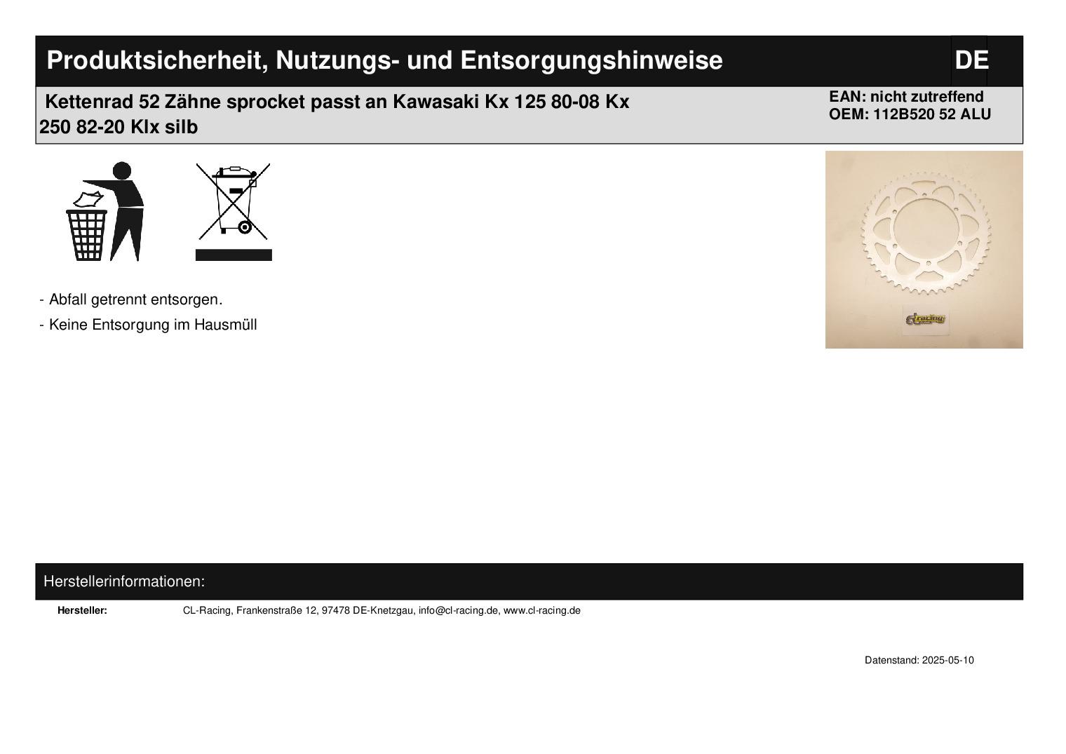 In dieser Auktion gibt es folgenden Artikel zu kaufen:  Kettenrad (siehe Foto)      Modell:     passend für Kawasaki Kx 125 A Bj.: 1980 - 1981 (2-Takt)     Kx 125 A Bj.: 1982 - 1983 (2-Takt)      Kx 250 C Bj.: 1983 - 1984 (2-Takt)Kx 125 C Bj.: 1984 (2-Takt) Kx 125 D Bj.: 1985 (2-Takt) Kx 125 E Bj.: 1986 - 1987 (2-Takt) Kx 125 F Bj.: 1988 (2-Takt) Kx 125 G Bj.: 1989 (2-Takt) Kx 125 H Bj.: 1990 - 1991 (2-Takt) Kx 125 J Bj.: 1992 - 1993 (2-Takt) Kx 125 K Bj.: 1994 - 1998 (2-Takt) Kx 125 L Bj.: 1999 - 2002 (2-Takt) Kx 125 M Bj.: 2003 - 2008 (2-Takt) Kx 250 B Bj.: 1982 (2-Takt) Kx 250 D Bj.: 1985 - 1986 (2-Takt) Kx 250 E Bj.: 1987 Kx 250 F Bj.: 1988 (2-Takt)       Kx 250 G Bj.: 1989 (2-Takt)            Kx 250 H Bj.: 1990 - 1991 (2-Takt) Kx 250 J Bj.: 1992 - 1993 (2-Takt) Kx 250 K Bj.: 1994 - 1998 (2-Takt) Kx 250 L Bj.: 1999 - 2002 (2-Takt) Kx 250 M Bj.: 2003 - 2004 (2-Takt) Kx 250 R Bj.: 2005 - 2008 (2-Takt) Kxf 250 Bj.: 2004 - 2020 (4-Takt)    Kxf 450 Bj.: 2006 - 2020 (4-Takt)                   Kx 500 A Bj.: 1983 - 1984 (2-Takt)  Kx 500 B Bj.: 1985 - 1986 (2-Takt) Kx 500 C Bj.: 1987 (2-Takt) Kx 500 D Bj.: 1988 (2-Takt) Kx 500 E Bj.: 1989 - 2003 (2-Takt)    Klx 250 R Bj.: 1994 - 1997 (4-Takt)                    Klx 250 S Bj.: 2009 - 2017 (4-Takt)    Klx 300 R Bj.: 1997 - 2003 (4-Takt)               Klx 450 R Bj.: 2007 - 2020 (4-Takt)            Klx 650 R Bj.: 1993 - 1995, 1999 - 2001 (4-Takt) passend für Suzuki Rmz 250 Bj.: 2004 - 2006 (4-Takt) Details: Zähnezahl: 52 Vor dem Kauf bitte Übersetzung mit Ihrem Fahrzeug vergleichen! Lieferumfang: 1 Stück     Artikelzustand:  neu  Es handelt sich hierbei um kein Originalteil    Bei Unklarheiten oder Fragen bitte erst E-Mail schreiben.