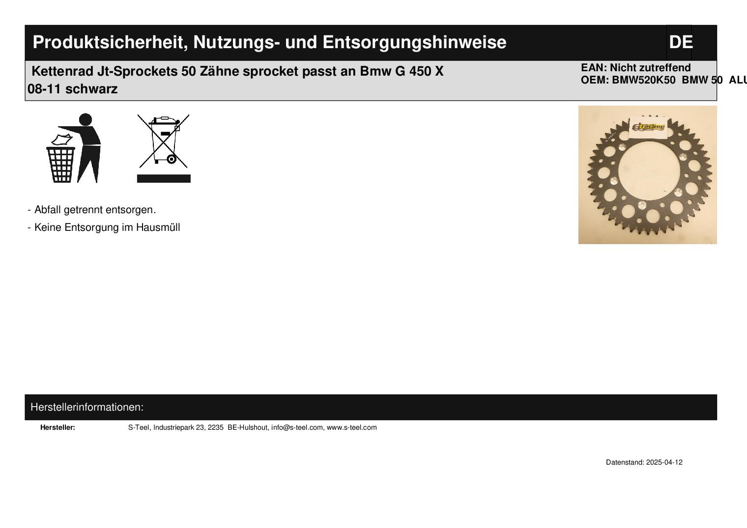 In dieser Auktion gibt es folgenden Artikel zu kaufen:  Kettenrad (siehe Foto)     Modell:   passend für BMW  G 450 X Bj.: 2008 - 2011 Abmaße: Innendurchmesser: 130 mm Lochkreis: 152 mm (Mitte Bohrung) Anzahl der Bohrungen: 6 Teilung: 520 Zähne: 50 Vor dem Kauf bitte Übersetzung mit Ihrem Fahrzeug vergleichen! Lieferumfang: 1 Stück     Artikelzustand:  neu  Es handelt sich hierbei um kein Originalteil!    Bei Unklarheiten oder Fragen bitte erst E-Mail schreiben.