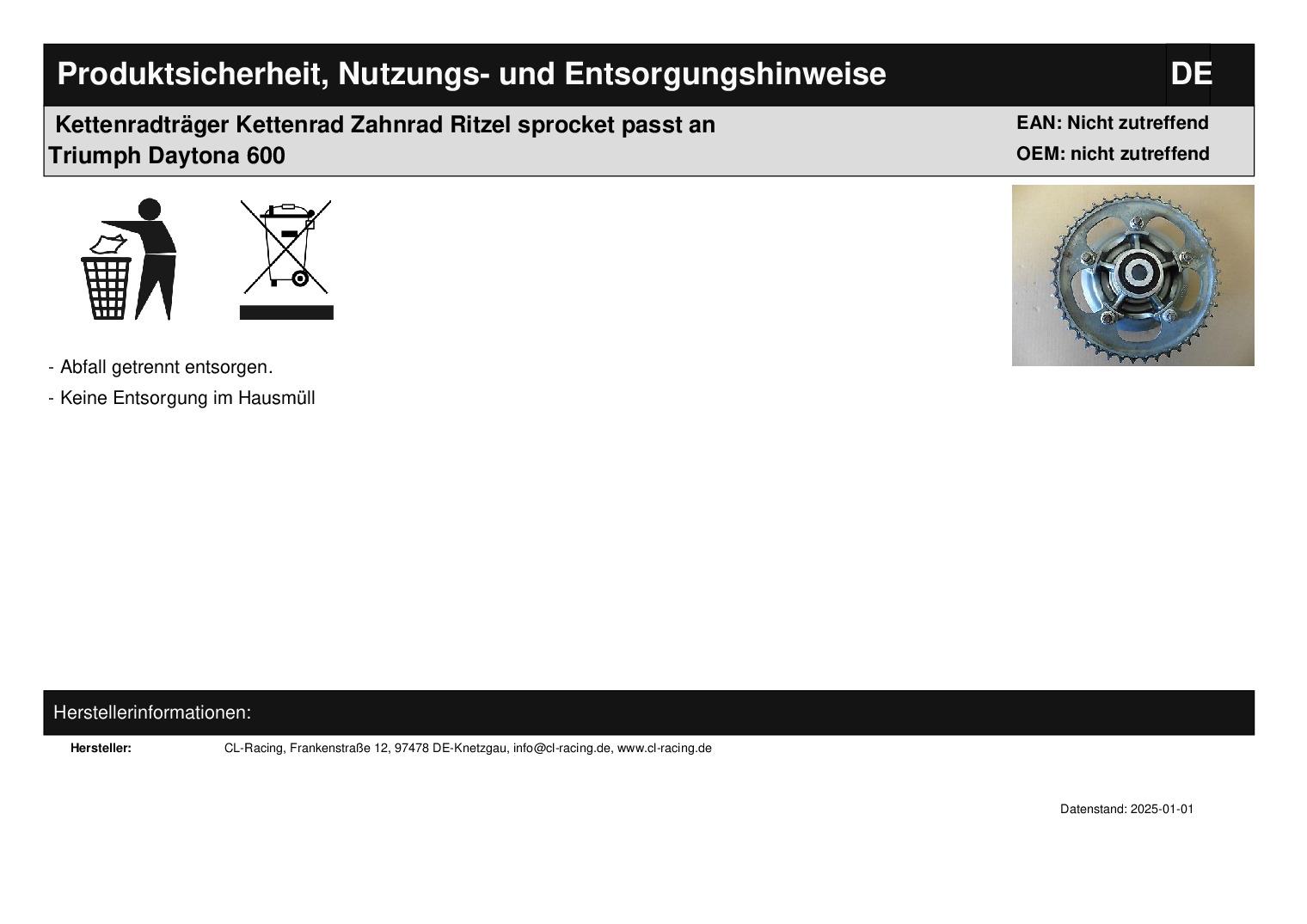 In dieser Auktion gibt es folgenden Artikel zu kaufen: originaler Kettenradträger mit Kettenrad (siehe Foto) Fahrzeug: passend für Triumph Daytona 600 Erstzulassung: 03.2004 evtl. auch für andere Modelle verwendbar, bitte erst vorher fragen Vor dem Kauf bitte Übersetzung mit Ihrem Fahrzeug vergleichen! Lieferumfang: siehe Foto Artikelzustand: normale Gebrauchsspuren vorhanden; Zustand siehe Foto Bei Unklarheiten oder Fragen bitte erst E-Mail schreiben.