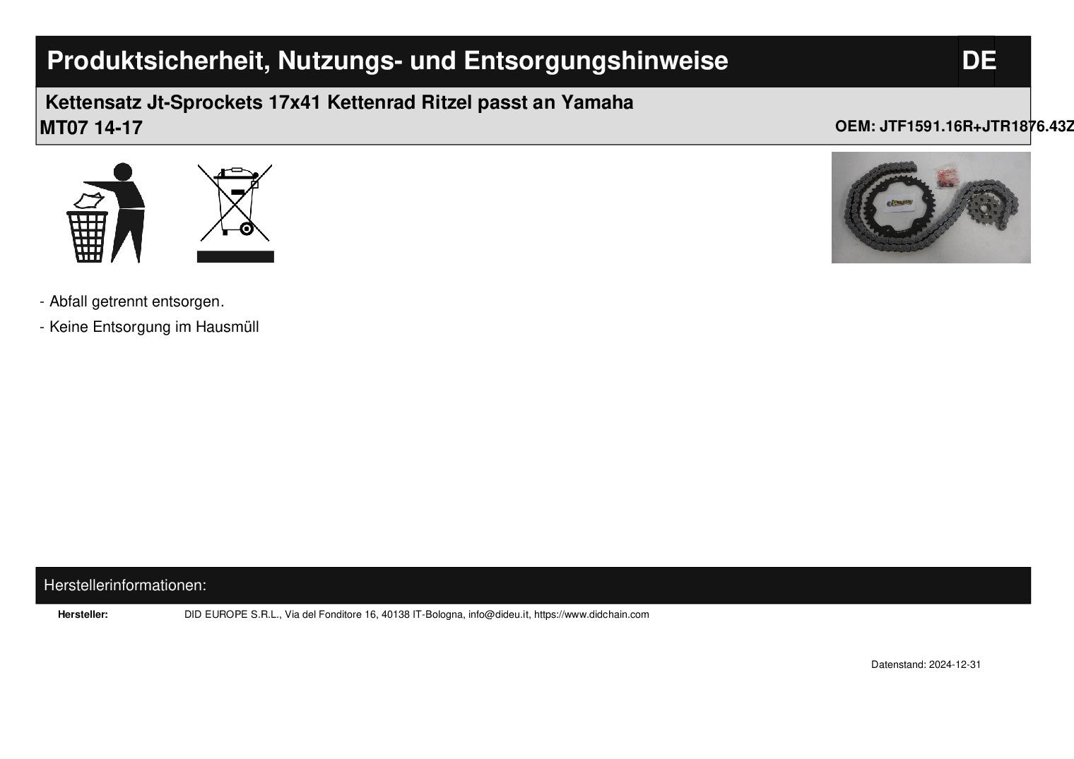 In dieser Auktion gibt es folgenden Artikel zu kaufen:    Qualitäts-Kettensatz   (ähnlich Foto)        Modell:   passend für Yamaha  MT07 Bj.: 2014 - 2017 Vor dem Kauf bitte Übersetzung mit Ihrem Fahrzeug vergleichen! Lieferumfang: 1 x Kette mit Nietschloss DID 525 ZVM-X 108 ZB 1 x Ritzel JT-Sprockets gummigedämpft, 16 Zähne 1 x Kettenrad JT-Sprockets, 43 Zähne     Artikelzustand:  neu