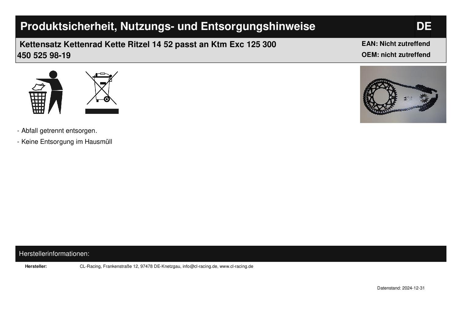 In dieser Auktion gibt es folgenden Artikel zu kaufen: Qualitäts-Kettensatz (ähnlich Foto) Modell: passend für Ktm SX, SXF-, EXC-Modelle Bj.: 1998 - 2019 Lc4-Modelle Bj.: 1995 - 2012 Vor dem Kauf bitte Übersetzung mit Ihrem Fahrzeug vergleichen! Lieferumfang: 1 x schwarzes Kettenrad aus Aluminium mit 52 Zähnen 1 x Ritzel mit 14 Zähnen 1 x Kette CZ 520 M 118 Glieder inklusive Kettenschloss Artikelzustand: neu Es handelt sich hierbei um kein Originalteil Weitere Übersetzungen auf Anfrage!