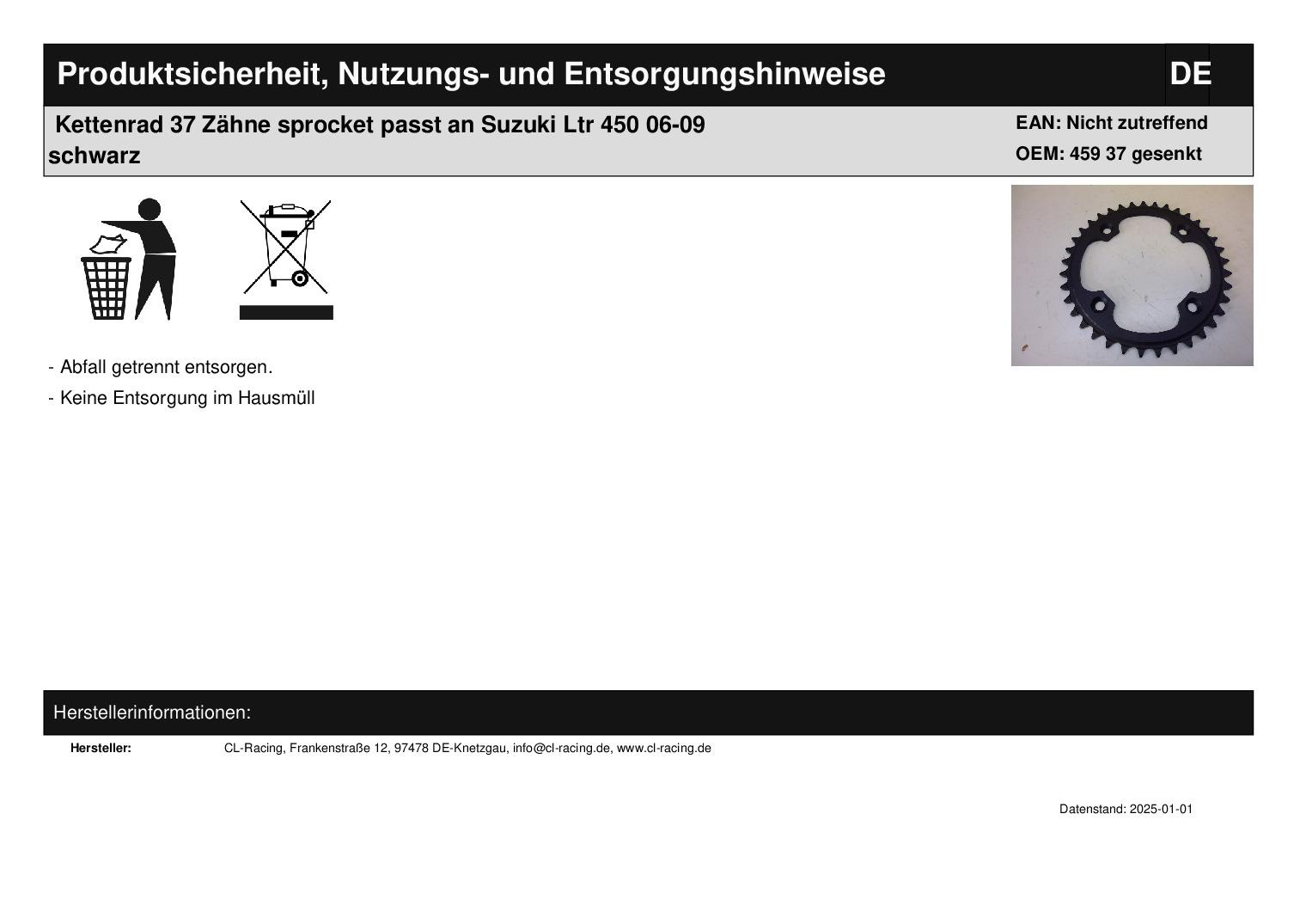 In dieser Auktion gibt es folgenden Artikel zu kaufen: Qualitäts-Kettenrad (siehe Foto) Modell: passend für Suzuki Ltr 450 Bj.: 2006 - 2009 Zä hnezahl: 37 Vor dem Kauf bitte Übersetzung mit Ihrem Fahrzeug vergleichen! Lieferumfang: 1 Stück Artikelzustand: neu aus Geschäftsauflösung, mit leichten Lagerspuren; Zustand siehe Foto Bei Unklarheiten oder Fragen bitte erst E-Mail schreiben.