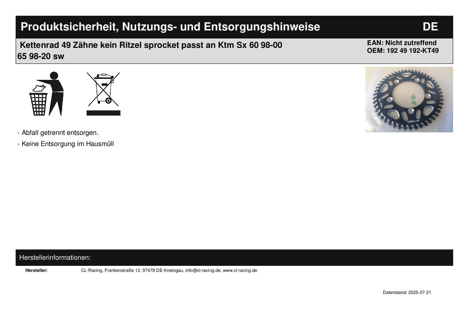 Titel: Kettenrad 49 Zähne kein Ritzel sprocket passt an Ktm Sx 60 98-00 65 98-20 sw