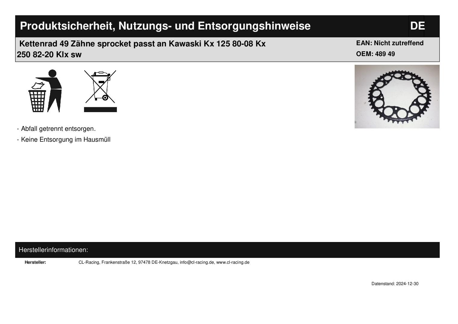 In dieser Auktion gibt es folgenden Artikel zu kaufen: Qualitäts-Kettenrad (siehe Foto) Modell: passend für Kawasaki Kx 125 A Bj.: 1980 - 1981 (2-Takt) Kx 125 A Bj.: 1982 - 1983 (2-Takt) Kx 250 C Bj.: 1983 - 1984 (2-Takt)Kx 125 C Bj.: 1984 (2-Takt) Kx 125 D Bj.: 1985 (2-Takt) Kx 125 E Bj.: 1986 - 1987 (2-Takt) Kx 125 F Bj.: 1988 (2-Takt) Kx 125 G Bj.: 1989 (2-Takt) Kx 125 H Bj.: 1990 - 1991 (2-Takt) Kx 125 J Bj.: 1992 - 1993 (2-Takt) Kx 125 K Bj.: 1994 - 1998 (2-Takt) Kx 125 L Bj.: 1999 - 2002 (2-Takt) Kx 125 M Bj.: 2003 - 2008 (2-Takt) Kx 250 B Bj.: 1982 (2-Takt) Kx 250 D Bj.: 1985 - 1986 (2-Takt) Kx 250 E Bj.: 1987 Kx 250 F Bj.: 1988 (2-Takt) Kx 250 G Bj.: 1989 (2-Takt) Kx 250 H Bj.: 1990 - 1991 (2-Takt) Kx 250 J Bj.: 1992 - 1993 (2-Takt) Kx 250 K Bj.: 1994 - 1998 (2-Takt) Kx 250 L Bj.: 1999 - 2002 (2-Takt) Kx 250 M Bj.: 2003 - 2004 (2-Takt) Kx 250 R Bj.: 2005 - 2008 (2-Takt) Kxf 250 Bj.: 2004 - 2020 (4-Takt) Kxf 450 Bj.: 2006 - 2020 (4-Takt) Kx 500 A Bj.: 1983 - 1984 (2-Takt) Kx 500 B Bj.: 1985 - 1986 (2-Takt) Kx 500 C Bj.: 1987 (2-Takt) Kx 500 D Bj.: 1988 (2-Takt) Kx 500 E Bj.: 1989 - 2003 (2-Takt) Klx 250 R Bj.: 1994 - 1997 (4-Takt) Klx 250 S Bj.: 2009 - 2017 (4-Takt) Klx 300 R Bj.: 1997 - 2003 (4-Takt) Klx 450 R Bj.: 2007 - 2020 (4-Takt) Klx 650 R Bj.: 1993 - 1995, 1999 - 2001 (4-Takt)passend für Suzuki Rmz 250 Bj.: Bj.: 2004 - 2006 (4-Takt) Details: Zähnezahl: 49 Teilung: 520 Lochkreis Durchmesser: 150 mm Innendurchmesser: 134 mm Löcher: 6 Vor dem Kauf bitte Übersetzung mit Ihrem Fahrzeug vergleichen! Lieferumfang: 1 Stück Artikelzustand: neu aus Geschäftsauflösung, mit leichten Lagerspuren; Zustand siehe Foto Bei Unklarheiten oder Fragen bitte erst E-Mail schreiben.