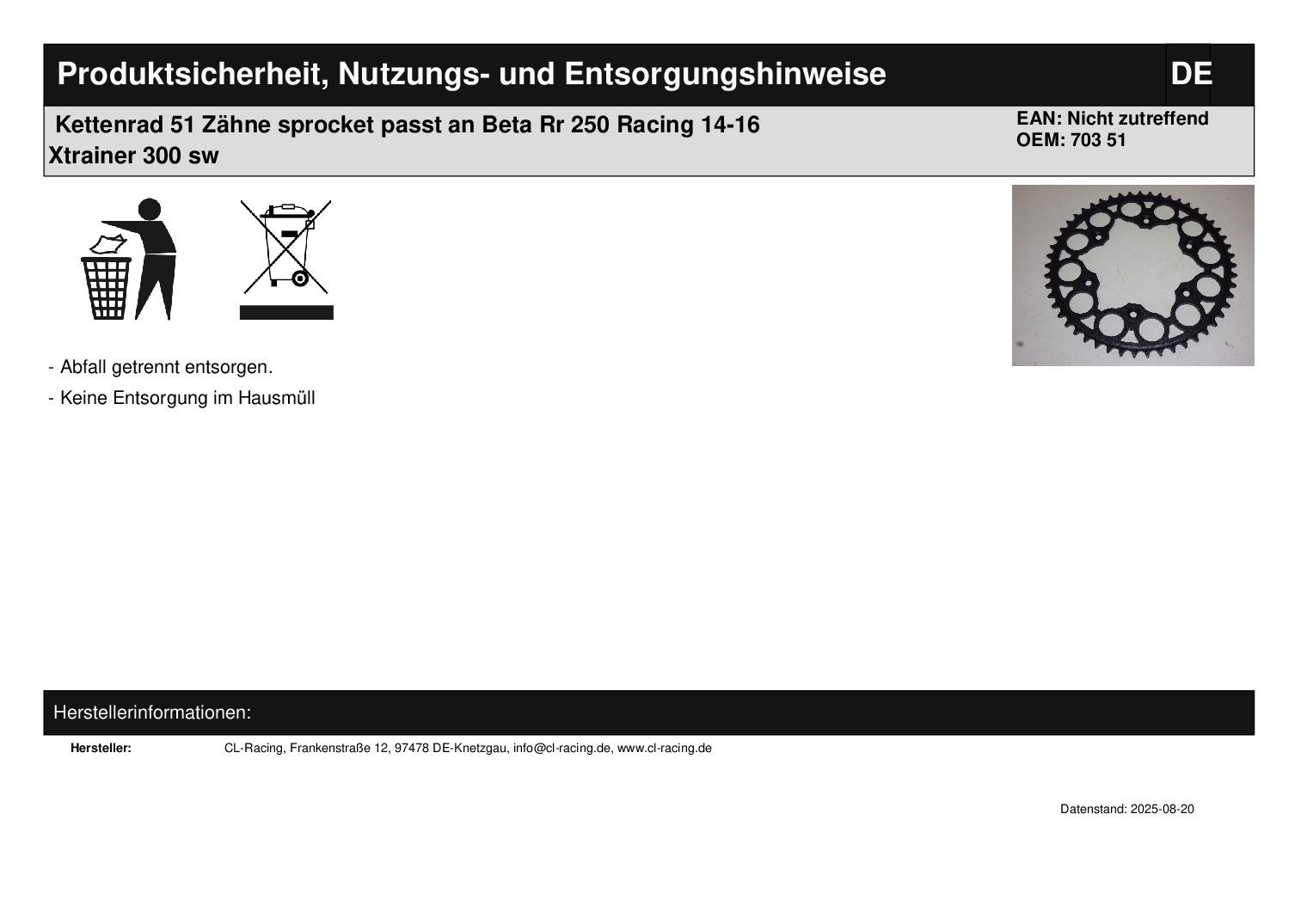 In dieser Auktion gibt es folgenden Artikel zu kaufen: Qualitäts-Kettenrad (siehe Foto) Modell: passend für Beta RR 250 Enduro Bj.: 13 - 17 RR 250 Oilmix Enduro Bj.: 18 RR 250 Racing Bj.: 14 - 16 RR 300 Enduro, Racing Bj.: 13 - 16 RR 300 Oilmix Enduro Bj.: 18 RR 350 Enduro Bj.: 13 - 14 RR 350 Racing Bj.: 13 RR 350 EFI Enduro Bj.: 15 - 18 RR 350 EFI Racing Bj.: 15 - 17 RR 390 EFI Enduro Bj.: 15 - 18 RR 390 EFI Racing Bj.: 16 - 17 RR 400 Enduro Bj.: 13 - 14 RR 430 EFI Enduro Bj.: 15 - 18 RR 430 EFI Racing Bj.: 15 - 16 RR 450 Enduro Bj.: 13 - 14 RR 450 Racing Bj.: 13 - 14 RR 480 EFI Enduro Bj.: 15 - 18 RR 480 EFI Racing Bj.: 15 - 17 RR 498 Enduro Bj.: 13 - 14 RR 498 Racing Bj.: 13 - 14 Xtrainer 300 Bj.: 15 - 16 Abmaße: Innendurchmesser: 125 mm Lochkreis: 152 mm (Mitte Bohrung) Bohrung: 8,5 mm Anzahl der Bohrungen: 6 Zä hnezahl: 51 Vor dem Kauf bitte Übersetzung mit Ihrem Fahrzeug vergleichen! Lieferumfang: 1 Stück Artikelzustand: neu aus Geschäftsauflösung, mit leichten Lagerspuren; Zustand siehe Foto Bei Unklarheiten oder Fragen bitte erst E-Mail schreiben.