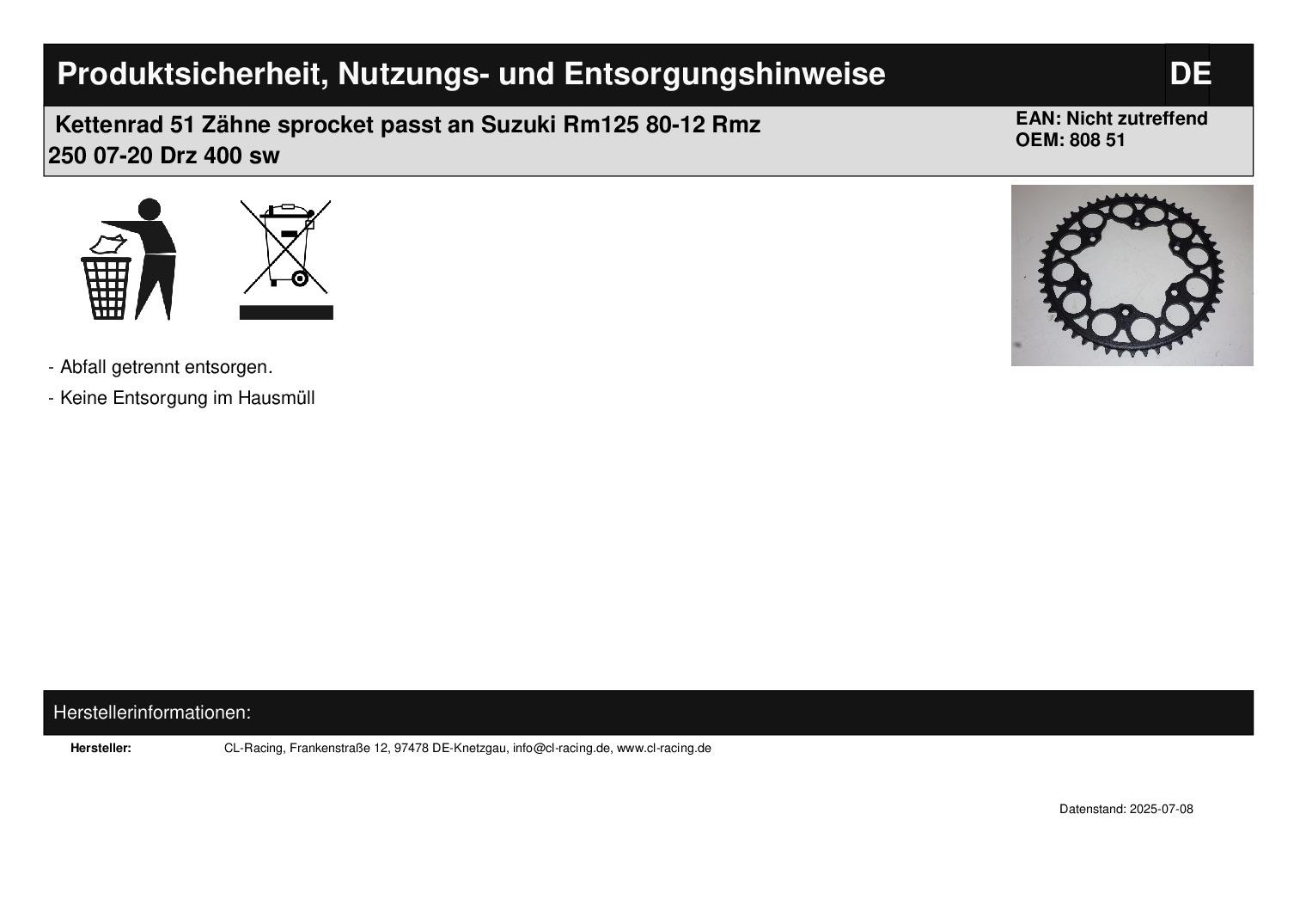 In dieser Auktion gibt es folgenden Artikel zu kaufen: Qualitäts-Kettenrad (siehe Foto) Modell: passend für Suzuki RM 125 Bj.: 1980 - 2012 RM 250 Bj.: 1981 - 1983, 1987 - 2012 RM-Z 250 Bj.: 2007 - 2020 RM-Z 450 Bj.: 2005 - 2020 RMX 450 Z Bj.: 2010 - 2017 DR 350 Bj.: 1990 - 1995 DR 350 SE Bj.: 1996 - 1997 DR-Z 400 Bj.: 2000 - 2004 DR-Z 400 E Bj.: 2000 - 2007 DR-Z 400 S Bj.: 2000 - 2008 DR-Z 400 SM Bj.: 2005 - 2008 DR-Z 400 SMU Bj.: 2005 - 2007 Zä hnezahl: 51 Vor dem Kauf bitte Übersetzung mit Ihrem Fahrzeug vergleichen! Lieferumfang: 1 Stück Artikelzustand: neu aus Geschäftsauflösung, mit leichten Lagerspuren; Zustand siehe Foto Bei Unklarheiten oder Fragen bitte erst E-Mail schreiben.