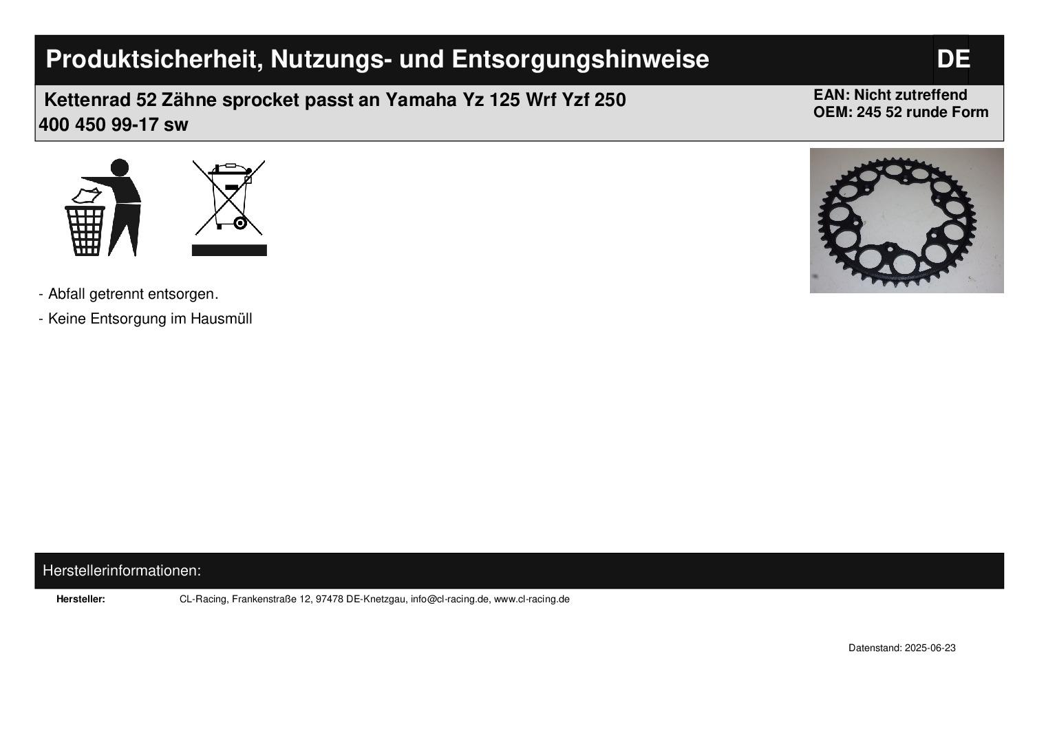 Titel: Kettenrad 52 Zähne sprocket passt an Yamaha Yz 125 Wrf Yzf 250 400 450 99-17 sw