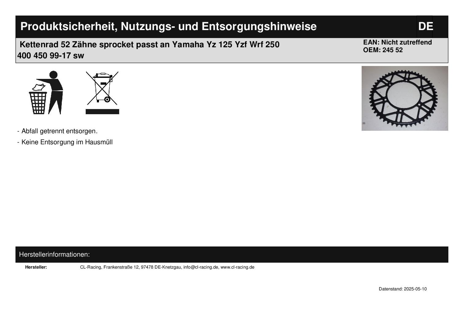 In dieser Auktion gibt es folgenden Artikel zu kaufen: Qualitäts-Kettenrad (siehe Foto) Modell: passend für Yamaha Yz 125, 250 Bj.: 1999 - 2017 (2-Takt) Yzf 250, 400, 426, 450 Bj.: 1999 - 2017 (4-Takt) Wrf 250, 400, 426, 450 Bj.: 1999 - 2017 (4-Takt) Zä hnezahl: 52 Vor dem Kauf bitte Übersetzung mit Ihrem Fahrzeug vergleichen! Lieferumfang: 1 Stück Artikelzustand: neu aus Geschäftsauflösung, mit leichten Lagerspuren; Zustand siehe Foto Bei Unklarheiten oder Fragen bitte erst E-Mail schreiben.