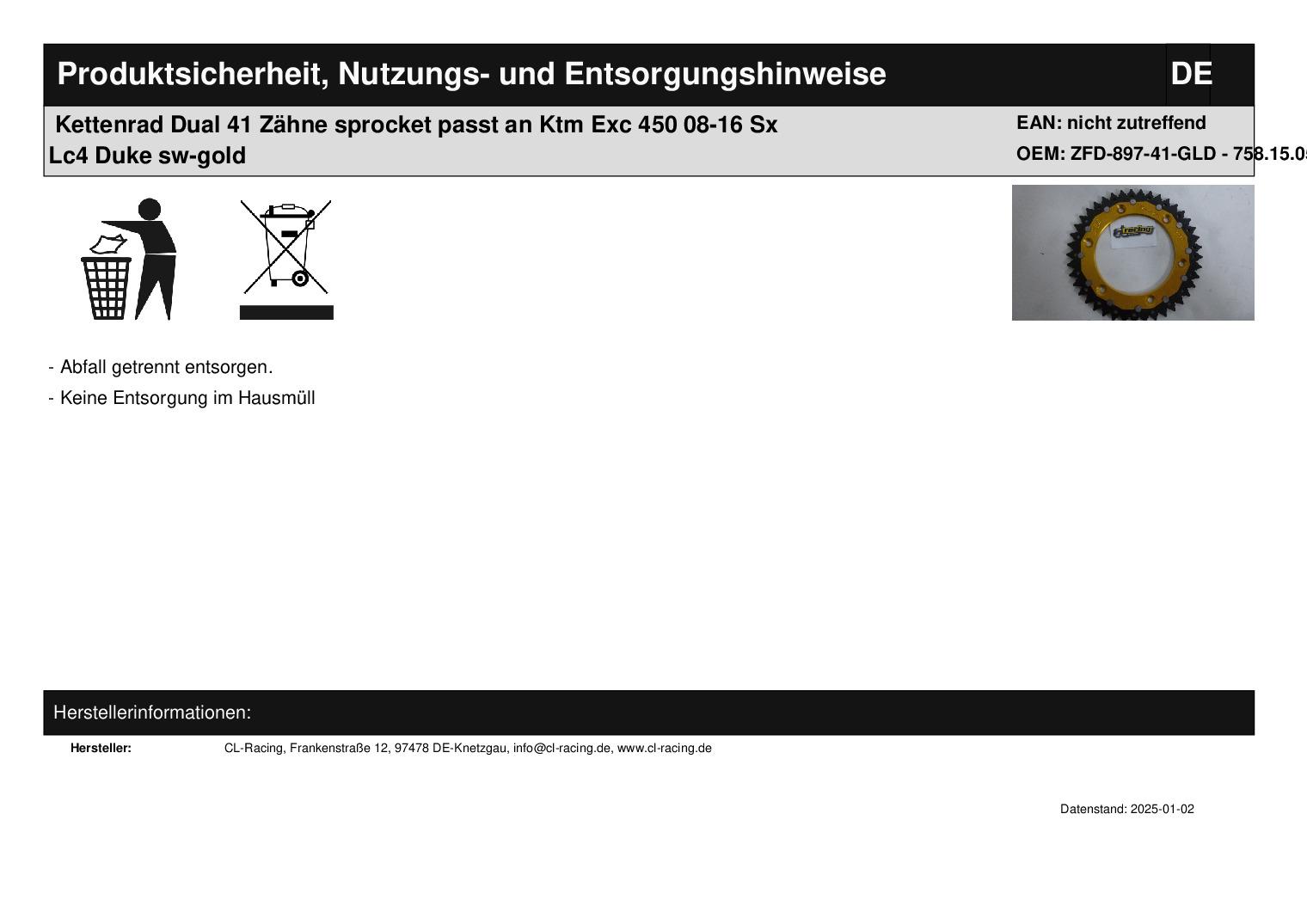 In dieser Auktion gibt es folgenden Artikel zu kaufen: Dual-Kettenrad (siehe Foto) Modell: passend für Husaberg FC 450 Bj.: 2004 - 2006 FC 470 Bj.: 2001 - 2002 FC 501 Bj.: 2000 FC 550 Bj.: 2001 - 2006 FC 600 Bj.: 2000 FE 250 i.e. Bj.: 2013 - 2014 FE 350 i.e. Bj.: 2013 - 2014 FE 390 i.e. Bj.: 2010 - 2012 FE 400 Bj.: 2000 - 2003 FE 450 Bj.: 2004 - 2014 FE 501 Bj.: 1995 - 2014 FE 550 Bj.: 2004 - 2008 FE 570 Bj.: 2009 - 2012 FE 600 Bj.: 2000 FE 650 Bj.: 2001 - 2008 FS 400 Bj.: 2001 - 2003 FS 450 Bj.: 2004 - 2008 FS 570 Bj.: 2010 - 2011 FS 650 Bj.: 2001 - 2008 FX 450 Bj.: 2010 - 2011 TE 125 Bj.: 2012 - 2014 TE 250 Bj.: 2011 - 2014 TE 300 Bj.: 2011 - 2014 passend für Husqvarna FE 701 Bj.: 2016 FC 250 Bj.: 2014 - 2017 FC 350 Bj.: 2014 - 2017 FC 450 Bj.: 2014 - 2017 FE 250 Bj.: 2014 - 2017 FE 350 Bj.: 2014 - 2017 FE 450 Bj.: 2014 - 2017 FE 501 Bj.: 2014 - 2017 FS 450 Bj.: 2015 - 2017 FS 701 Bj.: 2016 TC 125 Bj.: 2014 - 2017 TC 250 Bj.: 2014 - 2017 TE 125 Bj.: 2014 - 2016 TE 250 Bj.: 2014 - 2017 TE 300 Bj.: 2014 - 2017 TX 125 Bj.: 2017 passend für Ktm Adventure 640 R Bj.: 1999 - 2007 Duke 400 Bj.: 1994 - 1995 Duke 620 Bj.: 1994 - 1998 Duke 690 Bj.: 2008 - 2016 Duke II 640 Bj.: 1999 - 2007 E-GS 600 LC4 Bj.: 1993 EGS 125 2T Bj.: 1993 - 1999 EGS 200 2T Bj.: 1998 - 1999 EGS 250 2T Bj.: 1993 - 1999 EGS 300 2T Bj.: 1993 - 1999 EGS 350 LC4 Bj.: 1993 - 1994 EGS 360 2T Bj.: 1996 - 1997 EGS 380 2T Bj.: 1998 - 1999 EGS 400 LC4 Bj.: 1993 - 1997 EGS 620 LC4 Bj.: 1994 - 1995 EGS-E 400 LC4 Bj.: 1997 Enduro 690 Bj.: 2008 - 2016 EXC 125 2T Bj.: 1993 - 2016 EXC 200 2T Bj.: 1998 - 2016 EXC 250 2T Bj.: 1993 - 2017 EXC 300 2T Bj.: 1993 - 2017 EXC 350 LC4 Bj.: 1993 EXC 360 2T Bj.: 1996 - 1997 EXC 380 2T Bj.: 1998 - 2001 EXC 400 Bj.: 2000 - 2007 EXC 440 Bj.: 1994 - 1995 EXC 450 Bj.: 2008 - 2016 EXC 500 Bj.: 2012 - 2016 EXC 520 Bj.: 2000 - 2001 EXC 520 Bj.: 2002 - 2007 EXC 530 Bj.: 2008 - 2011 EXC 600 Bj.: 1993 EXC 612 Bj.: 1993 EXC 620 Bj.: 1994 - 1997 EXC-E 300 Bj.: 2007 - 2016 EXC-F 250 Bj.: 2007 - 2017 EXC-F 350 Bj.: 2012 - 2017 EXC-F 450 Bj.: 2017 EXC-F 500 Bj.: 2017 EXE 125 Bj.: 2000 LC4-E 640 Bj.: 1998 - 2006 MXC 525 Bj.: 2003 - 2005 Rally Factory Replica 690 Bj.: 2009 - 2010 SC 350 LC4 Bj.: 1994 - 1995 SC 400 LC4 Bj.: 1995 - 1999 SC 620 LC4 Bj.: 1994 - 2002 SMC 625 Bj.: 2004 - 2006 SMC 660 Bj.: 2003 - 2006 SMC 690 Bj.: 2008 - 2016 SMR 450 B j.: 2005 - 2014 SMR 525 Bj.: 2004 - 2005 SMR 560 Bj.: 2006 - 2007 Sting 125 2T Bj.: 1997 - 1998 Supermoto 690 Bj.: 2007 SX 125 2T Bj.: 1993 - 2017 SX 150 2T Bj.: 2009 - 2010 + 2017 SX 200 2T Bj.: 2003 SX 200 2T Bj.: 2004 SX 250 2T Bj.: 1993 56PS 41Kw SX 250 2T Bj.: 1994 56PS 41Kw SX 250 2T Bj.: 1995 56PS 41Kw SX 250 2T Bj.: 1996 56PS 41Kw SX 250 2T Bj.: 1997 56PS 41Kw SX 250 2T Bj.: 1998 56PS 41Kw SX 250 2T Bj.: 1999 56PS 41Kw SX 250 2T Bj.: 2000 56PS 41Kw SX 250 2T Bj.: 2001 56PS 41Kw SX 250 2T Bj.: 2002 56PS 41Kw SX 250 2T Bj.: 2003 56PS 41Kw SX 250 2T Bj.: 2004 53PS 39Kw SX 250 2T Bj.: 2005 56PS 41Kw SX 250 2T Bj.: 2006 56PS 41Kw SX 250 2T Bj.: 2007 56PS 41Kw SX 250 2T Bj.: 2008 56PS 41Kw SX 250 2T Bj.: 2009 56PS 41Kw SX 250 2T Bj.: 2010 56PS 41Kw SX 250 2T Bj.: 2011 56PS 41Kw SX 250 2T Bj.: 2012 56PS 41Kw SX 250 2T Bj.: 2013 SX 250 2T Bj.: 2014 SX 250 2T Bj.: 2015 SX 250 2T Bj.: 2016 SX 250 2T Bj.: 2017 SX 300 2T Bj.: 1993 17/52PS 13/38Kw SX 300 2T Bj.: 1994 17/52PS 13/38Kw SX 300 2T Bj.: 1995 17/52PS 13/38Kw SX 360 2T Bj.: 1996 60PS 44Kw SX 360 2T Bj.: 1997 60PS 44Kw SX 380 2T Bj.: 1998 64PS 47Kw SX 380 2T Bj.: 1999 64PS 47Kw SX 380 2T Bj.: 2000 59PS 43Kw SX 380 2T Bj.: 2001 59PS 43Kw SX 380 2T Bj.: 2002 59PS 43Kw SX 400 Bj.: 2000 SX 400 Bj.: 2001 SX 400 Bj.: 2002 SX 440 2T Bj.: 1994 SX 450 Bj.: 2003 54 5PS 40Kw SX 450 Bj.: 2004 54 5PS 40Kw SX 450 Bj.: 2005 54 5PS 40Kw SX 450 Bj.: 2006 54 5PS 40Kw SX 500 2T Bj.: 1992 - 1993 60PS 44Kw SX 500 2T Bj.: 1994 1995 60PS 44Kw SX 520 Bj.: 2000 59PS 43Kw SX 520 Bj.: 2001 59PS 43Kw SX 520 Bj.: 2002 59PS 43Kw SX 525 Bj.: 2003 57PS 42Kw SX 525 Bj.: 2004 57PS 42Kw SX 525 Bj.: 2005 57PS 42Kw SX 525 Bj.: 2006 57PS 42Kw SX 620 LC4 Bj.: 1994 59PS 43Kw SX 620 LC4 Bj.: 1995 60PS 44Kw SX 620 LC4 Bj.: 1996 60PS 44Kw SX 620 LC4 Bj.: 1997 60PS 44Kw SX 620 LC4 Bj.: 1998 60PS 44Kw SX 620 LC4 Bj.: 1999 60PS 44Kw SX-F 250 4T Bj.: 2006 39PS 29Kw SX-F 250 4T Bj.: 2007 39PS 29Kw SX-F 250 4T Bj.: 2008 39PS 29Kw SX-F 250 4T Bj.: 2009 39PS 29Kw SX-F 250 4T Bj.: 2010 39PS 29Kw SX-F 250 i.e.4T Bj.: 2011 39PS 29Kw SX-F 250 i.e.4T Bj.: 2012 39PS 29Kw SX-F 250 i.e.4T Bj.: 2013 SX-F 250 i.e.4T Bj.: 2014 SX-F 250 i.e.4T Bj.: 2015 SX-F 250 i.e.4T Bj.: 2016 SX-F 250 i.e.4T Bj.: 2017 SX-F 250 i.e.4T Bj.: 2017 SX-F 350 i.e 4T Bj.: 2011 48PS 35Kw SX-F 350 i.e 4T Bj.: 2012 48PS 35Kw SX-F 350 i.e 4 Bj.: T 2013 SX-F 350 i.e 4T Bj.: 2014 SX-F 350 i.e 4T Bj.: 2015 SX-F 350 i.e 4T Bj.: 2016 SX-F 350 i.e 4T Bj.: 2017 SX-F 450 i.e. Bj.: 2013 SX-F 450 i.e. Bj.: 2014 SX-F 450 i.e. Bj.: 2015 SX-F 450 i.e. Bj.: 2016 SX-F 450 i.e. Bj.: 2017 SX-F 450 i.e. Bj.: 2017 SX-F 450 Bj.: 2007 53PS 39Kw SX-F 450 Bj.: 2008 53PS 39Kw SX-F 450 Bj.: 2009 53PS 39Kw SX-F 450 Bj.: 2010 53PS 39Kw SX-F 450 Bj.: 2011 53PS 39Kw SX-F 450 Bj.: 2012 53PS 39Kw SX-F 505 Bj.: 2007 SX-F 505 Bj.: 2008 SXC 400 Bj.: 1997 SXC 400 Bj.: 1998 SXC 400 Bj.: 1999 SXC 540 Bj.: 1998 SXC 540 Bj.: 1999 SXC 620 LC4 Bj.: 1997 SXC 625 Bj.: 2003 32 5PS 24Kw SXC 625 Bj.: 2004 32 5PS 24Kw SXC 625 Bj.: 2005 29PS 21Kw SXC 625 Bj.: 2006 29PS 21Kw XC 525 Bj.: 2006 61PS 45Kw XC 525 Bj.: 2007 61PS 45Kw XC-W 125 2T Bj.: 2017 XC-W 150 2T Bj.: 2017 Abmaße: Innendurchmesser: ca. 125 mm Lochkreis: ca. 150 mm (Mitte Bohrung) Bohrung: ca. 8 mm Durchmesser Anzahl der Bohrungen: 6 Teilung: 520 Zähnezahl: 41 Vor dem Kauf bitte Übersetzung mit Ihrem Fahrzeug vergleichen! Lieferumfang: 1 Stück Artikelzustand: neu Es handelt sich hierbei um kein Originalteil Bei Unklarheiten oder Fragen bitte erst E-Mail schreiben.
