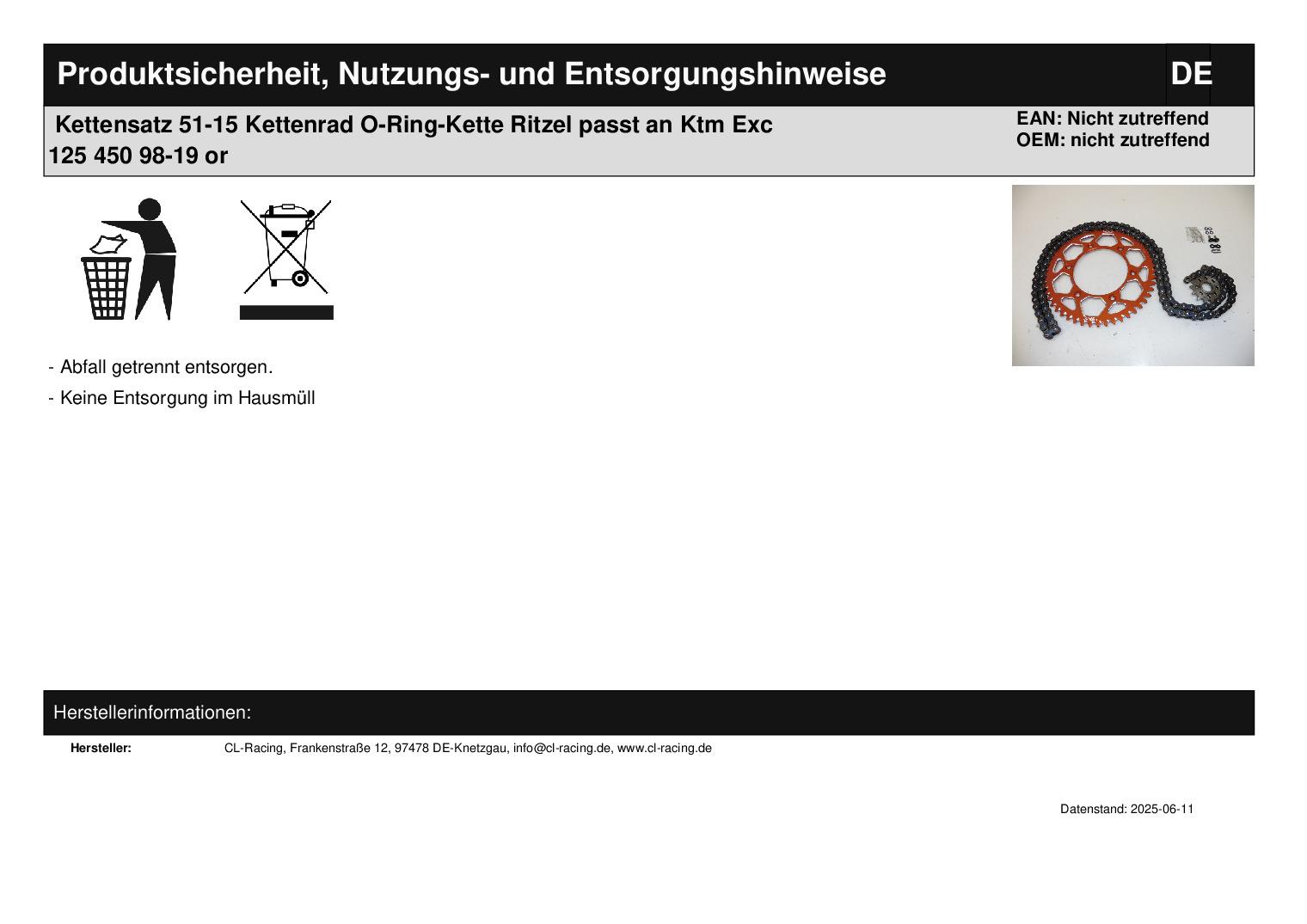 In dieser Auktion gibt es folgenden Artikel zu kaufen: Qualitäts-Kettensatz (ähnlich Foto) Modell: passend für KTM SX, SXF-, EXC-Modelle Bj.: 1998 - 2019 Lc4-Modelle Bj.: 1995 - 2012 Details: Zähnezahl: 15/51 Vor dem Kauf bitte Übersetzung mit Ihrem Fahrzeug vergleichen! Lieferumfang: 1 x oranges Kettenrad aus Aluminium mit 51 Zähnen 1 x Ritzel mit 15 Zähnen 1 x Kette CZ 520 ORM 118 Glieder inklusive Kettenschloss Artikelzustand: neu Hierbei handelt es sich um kein Originalteil! Bei Unklarheiten oder Fragen bitte erst E-Mail schreiben!