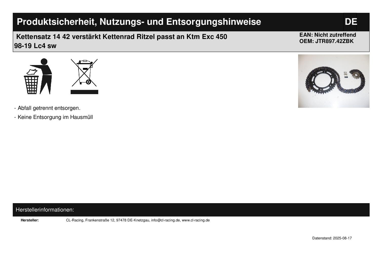 In dieser Auktion gibt es folgenden Artikel zu kaufen: Qualitäts-Kettensatz (ähnlich Foto) Im Vergleich zu Kettensätzen mit einer DID 520 VX3 Ketten hat dieser Kettensatz mit einer DID 520 ZVM-X Kette eine höhere Zugfestigkeit und dadurch auch eine höhere Lebensdauer! Durch das gummierte vordere Ritzel wird der Kettenschlag minimiert und das Motorrad läuft ruhiger. Modell: passend für Ktm LC4 690 Duke Bj.: 2008 - 2011 LC4 690 Duke ABS Bj.: 2012 - 2019 LC4 690 R Bj.: 2010 - 2012 LC4 690 R ABS Bj.: 2013 - 2017 LC4 690 Supermoto Bj.: 2007 - 2009 LC4 690 Supermoto Prestige Bj.: 2007 LC4 690 R Supermoto Bj.: 2008 - 2010 Vor dem Kauf bitte Übersetzung mit Ihrem Fahrzeug vergleichen da hier unterschiedliche Übersetzungen verbaut sind! Lieferumfang: 1 x JT-Sprocket Kettenrad aus Stahl mit 40 Zähnen 1 x JT-Sprocket Ritzel gummiert mit 16 Zähnen 1 x DID 520 ZVM-X X-Ring Kette mit 120 Glieder inkl. Hohlnietschloss Zugfestigkeit ca. 3970kg Kette muss auf die entsprechende Länge gekürzt werden! Artikelzustand: neu Es handelt sich hierbei um kein Originalteil Weitere Übersetzungen auf Anfrage! Bei Unklarheiten oder Fragen bitte erst E-Mail schreiben!