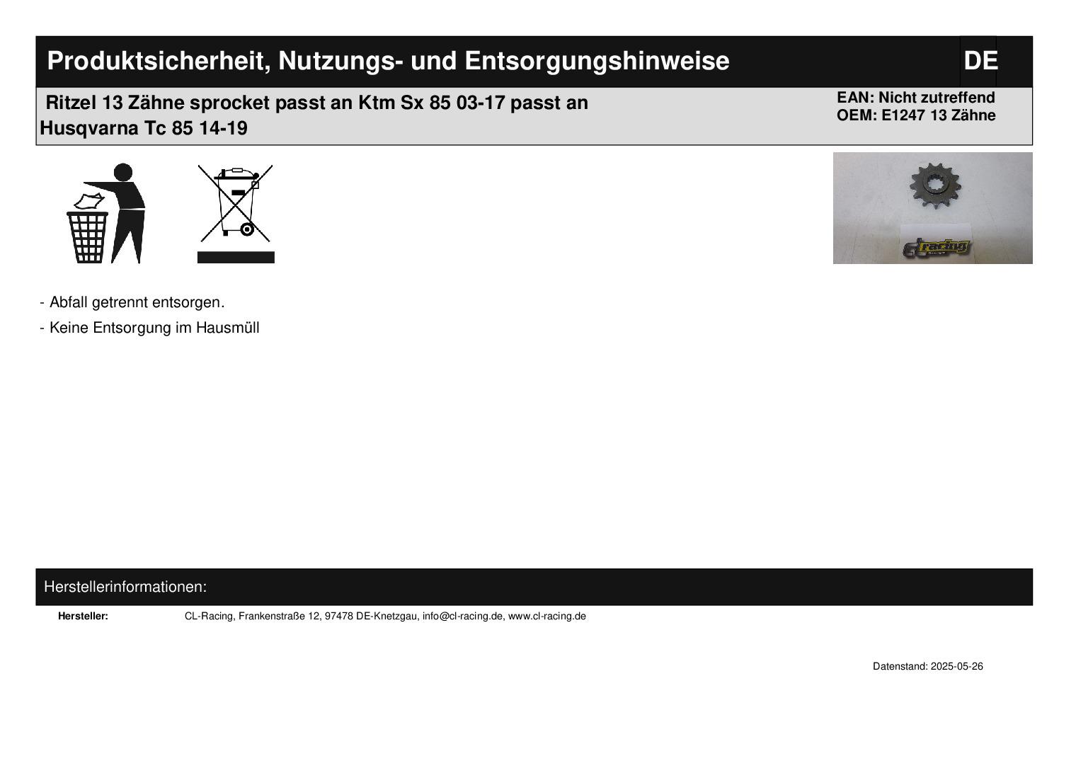 • Ritzel 13 Zähne sprocket passt an Ktm Sx 85 03-17 passt an Husqvarna Tc 85 14-19