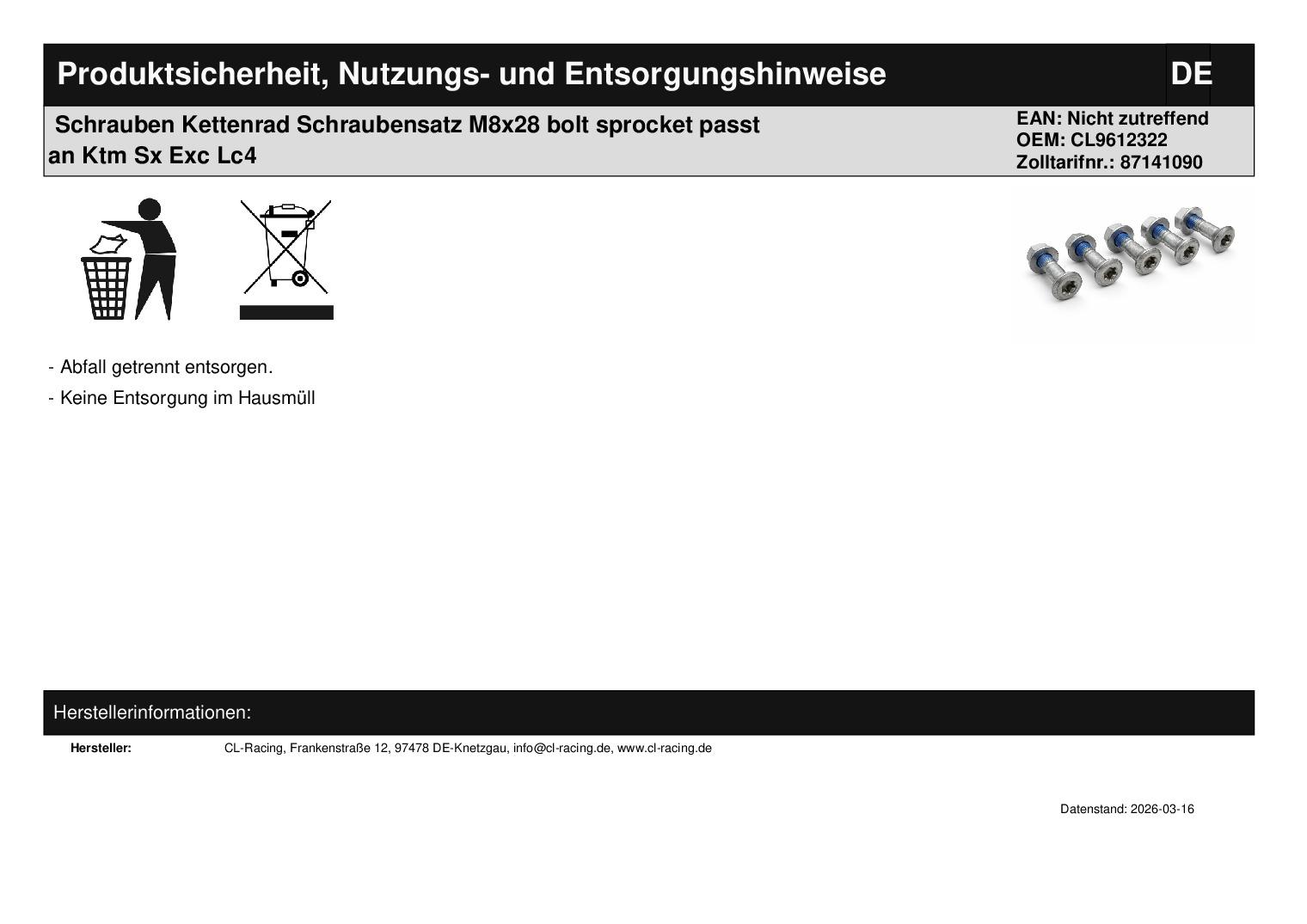In dieser Auktion gibt es folgenden Artikel zu kaufen: Schraubensatz für Kettenrad mit Vielzahn in Original-Qualität (siehe Foto) Modell: passend für Beta Evo 125 Bj.: 2009 - 2017 Evo 250 Bj.: 2010 - 2016 Evo 290 Bj.: 2009 - 2011 Evo 300 Bj.: 2009 - 2019 RR 50 Bj.: 2003 - 2017 RR 125 Bj.: 2017 - 2021 RR 250 Bj.: 2005 - 2021 RR 300 Bj.: 2013 - 2021 RR 350 Bj.: 2009 - 2021 RR 390 Bj.: 2015 - 2021 RR 400 Bj.: 2005 - 2014 RR 430 Bj.: 2015 - 2017 RR 450 Bj.: 2005 - 2014 RR 480 Bj.: 2015 - 2021 RR 498 Bj.: 2012 - 2015 RR 520 Bj.: 2010 - 2011 RR 525 Bj.: 2005 - 2009 passend für Husaberg FC 350 Bj.: 1995 - 1996 FC 400 Bj.: 1996 - 2000 FC 450 Bj.: 2004 - 2006 FC 470 Bj.: 2001 - 2002 FC 501 Bj.: 1994 - 2000 FC 550 Bj.: 2001 - 2006 FC 600 Bj.: 1993 - 2000 FE 250 Bj.: 2013 - 2014 FE 350 Bj.: 2013 - 2014 FE 390 Bj.: 2010 - 2012 FE 400 Bj.: 1996 - 2003 FE 450 Bj.: 2006 - 2014 FE 501 Bj.: 2004 + 2013 - 2014 FE 550 Bj.: 2004 - 2008 FE 570 Bj.: 2009 - 2012 FE 600 Bj.: 1994 - 2000 FE 650 Bj.: 2001 - 2008 passend für Husqvarna FC 250 Bj.: 2014 - 2017 FC 350 Bj.: 2014 - 2016 FC 450 Bj.: 2014 - 2016 FE 250 Bj.: 2014 - 2016 FE 350 Bj.: 2014 - 2016 FE 450 Bj.: 2014 - 2016 FE 501 Bj.: 2014 - 2016 FE 701 Bj.: 2016 passend für KTM EXC 125 Bj.: 2007 - 2011 EXC 200 Bj.: 2008 - 2011 EXC 250 Bj.: 2008 - 2011 EXC 300 Bj.: 2009 - 2011 EXC 350 Bj.: 1994 EXC 360 Bj.: 1996 - 1997 EXC 380 Bj.: 1998 - 2001 EXC 400 Bj.: 2009 - 2011 EXC 450 Bj.: 2009 - 2011 EXC 500 Bj.: 2012 - 2016 EXC 520 Bj.: 2000 - 2002 EXC 525 Bj.: 2003 - 2007 EXC 620 Bj.: 1994 - 1999 EXC 660 Bj.: 1996 - 1999 EXC-E 300 Bj.: 2007 - 2016 EXC-F 250 Bj.: 2007 - 2017 EXC-F 350 Bj.: 2012 - 2017 EXC-F 450 Bj.: 2017 EXC-F 500 Bj.: 2017 EXC-R 530 Bj.: 2008 - 2011 Enduro 690 Bj.: 2008 - 2016 LC4 400 Bj.: 1997 - 1998 LC4 640 Bj.: 1999 - 2006 LC4-E 400 Bj.: 1998 - 2001 LC4-E 640 Bj.: 1998 - 2001 SMC 625 Bj.: 2004 - 2006 SMC 660 Bj.: 2003 - 2006 SMC 690 Bj.: 2008 - 2016 SX 125 Bj.: 2005 - 2016 SX 150 Bj.: 2009 - 2015 SX 200 Bj.: 2003 - 2004 SX 250 Bj.: 2007 - 2016 SX 300 Bj.: 1993 - 1995 SX 360 Bj.: 1996 - 1997 SX 380 Bj.: 1998 - 2001 SX 400 Bj.: 2000 - 2002 SX 440 Bj.: 1994 SX 450 Bj.: 2003 - 2005 SX 500 Bj.: 1992 - 1995 SX 520 Bj.: 2000 - 2002 SX 525 Bj.: 2006 SX 620 Bj.: 1994 - 1999 SX-F 250 Bj.: 2006 - 2017 SX-F 350 Bj.: 2011 - 2017 SX-F 450 Bj.: 2007 - 2017 SX-F 505 Bj.: 2007 - 2008 SXC 400 Bj.: 1997 - 1999 SXC 540 Bj.: 1998 - 1999 SXC 620 Bj.: 1997 SXC 625 Bj.: 2003 - 2006 Supermoto 690 Bj.: 2007 - 2010 Abmaße: M8 x 28 mm Festigkeit: 10,8 Lieferumfang: 6 Stück Artikelzustand: neu Es handelt sich hierbei um kein Originalteil! Be i Unklarheiten oder Fragen bitte erst E-Mail schreiben.
