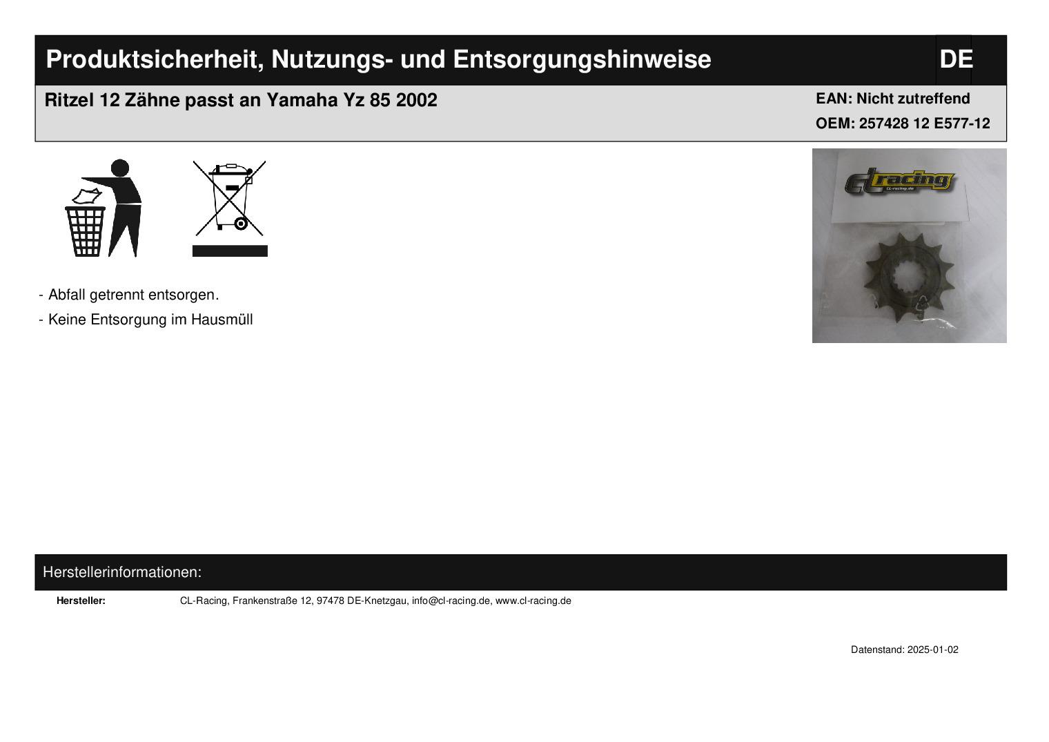 In dieser Auktion gibt es folgenden Artikel zu kaufen:    Ritzel (siehe Foto)      Modell:   passend für Yamaha  YZ 85 Bj.: 2002 Vor dem Kauf bitte Übersetzung mit Ihrem Fahrzeug vergleichen!     Zähnezahl:   12      Lieferumfang:   1 Stück       Artikelzustand:   neu  Hierbei handelt es sich um kein Originalteil!   Bei Unklarheiten oder Fragen bitte erst E-Mail schreiben.