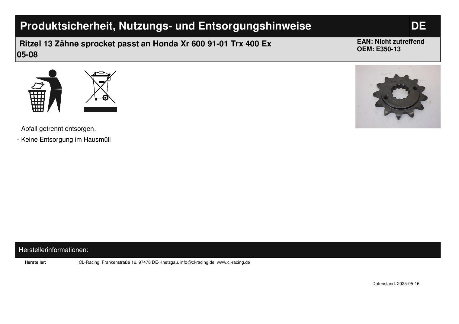 In dieser Auktion gibt es folgenden Artikel zu kaufen: Ritzel (siehe Foto) Modell: passend für Honda Xr 600 Bj.: 1991 - 2001 Trx 400 Ex Bj.: 2005 - 2008 Zähnezahl: 13 Vor dem Kauf bitte Übersetzung mit Ihrem Fahrzeug vergleichen! Lieferumfang: 1 Stück Artikelzustand: neu Bei Unklarheiten oder Fragen bitte erst E-Mail schreiben.