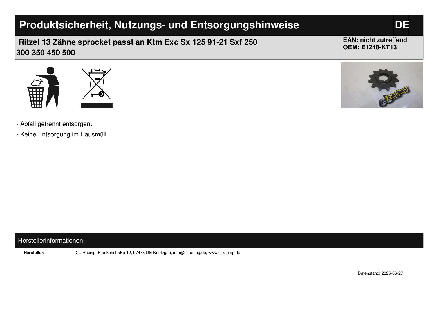 In dieser Auktion gibt es folgenden Artikel zu kaufen: Ritzel ( ähnlich Foto, mit 13 Zähnen) Modell: passend für Ktm Exc-Modelle 2-Takt Bj.: 1991 - 2021 Sx-Modelle ab 125 ccm 2-Takt Bj.: 1991 - 2021 Exc-Modelle 4-Takt Bj.: 2000 - 2021 Sxf-Modelle 4-Takt Bj.: 2000 - 2021 Freeride 250 R Bj.: 2014 - 2020 Freeride 350 R Bj.: 2012 -2017 Xc Quad 525 Desert Racing Bj.: 2006 - 2007 Xc Quad 450 Bj.: 2009 Xc Quad 525 Bj.: 2009 -2013 Xc-W 125 Bj.: 2017 - 2019 Xc-W 150 Bj.: 2017 - 2019 passend für Husaberg TE, FE, FS, FX Bj.: 2009 - 2014 passend für Husqvarna TE, FE, FC, FS Bj.: 2014 - 2021 passend für Beta RR 125 Bj.: 2018 - 2021 RR 200 Bj.: 2019 - 2021 RR 250 Bj.: 2005 - 2021 RR 300, 350, 390 Bj.: 2013 - 2021 RR 400 Bj.: 2005 - 2014 RR 430 Bj.: 2015 - 2020 RR 450 Bj.: 2005 - 2014 RR 480 Bj.: 2015 - 2021 RR 498 Bj.: 2012 - 2014 RR 520 Bj.: 2010 - 2011 RR 525 Bj.: 2005 - 2009 Xtrainer 250 Bj.: 2017 - 2021 Xtrainer 300 Bj.: 2017 - 2021 passend für Polaris Outlaw 450 MXR Bj.: 2008 - 2010 Outlaw 525 S Bj.: 2008 - 2010 Outlaw 525 IRS Bj.: 2008 - 2011 Zähnezahl: 13 Vor dem Kauf bitte Übersetzung mit Ihrem Fahrzeug vergleichen! Lieferumfang: 1 Stück Artikelzustand: neu Es handelt sich hierbei um kein Originalteil Bei Unklarheiten oder Fragen bitte erst E-Mail schreiben.