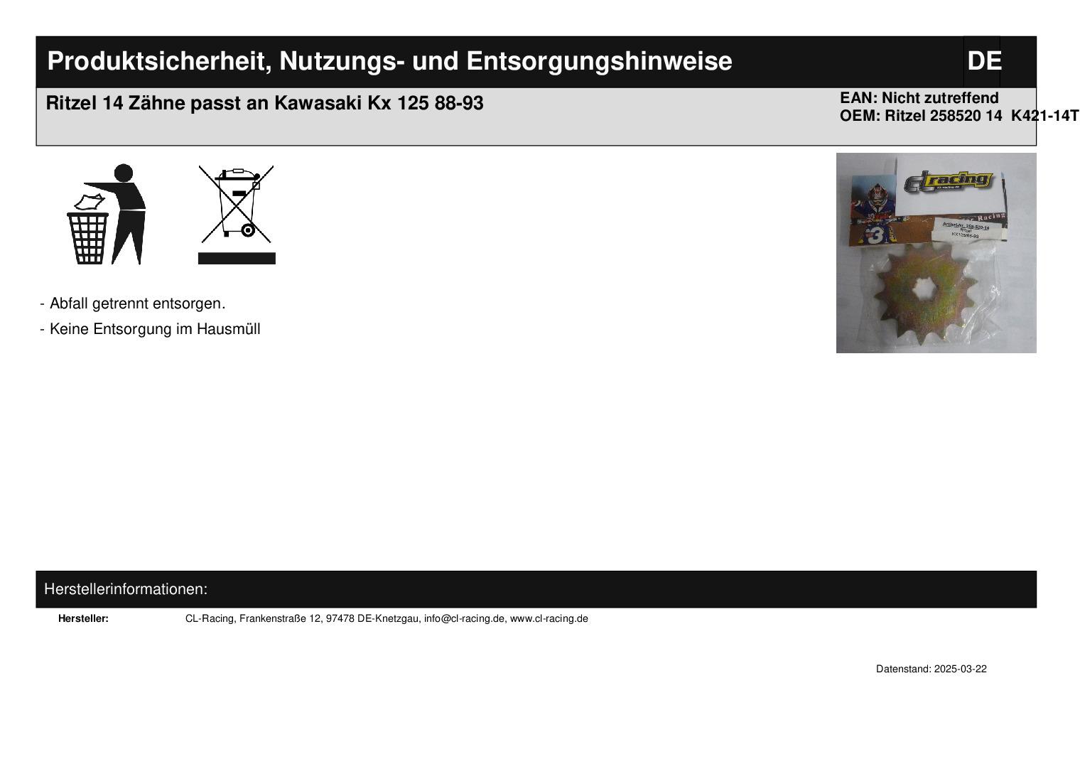 Herstellernummer: Ritzel 258520 14 K421-14T