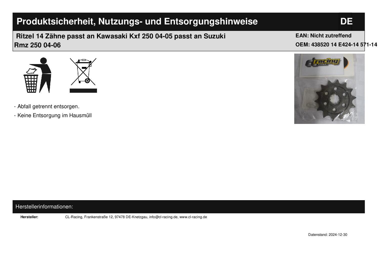 In dieser Auktion gibt es folgenden Artikel zu kaufen: Ritzel (siehe Foto) Modell: passend für Kawasaki KXF 250 Bj.: 2004 - 2005 passend für Suzuki RMZ 250 Bj.: 2004 - 2006 Vor dem Kauf bitte Übersetzung mit Ihrem Fahrzeug vergleichen! Lieferumfang: 1 Stück Artikelzustand: neu