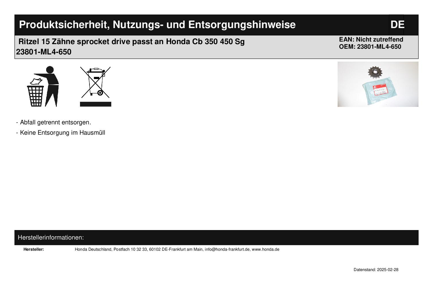 In dieser Auktion gibt es folgenden Artikel zu kaufen: Ritzel (siehe Foto) Modell: passend für Honda CB 350 SG Bj.: 1986 CB 450 SG Bj.: 1986 CB 350 SJ Bj.: 1988 Zähnezahl: 15 Vor dem Kauf bitte Übersetzung mit Ihrem Fahrzeug vergleichen! Lieferumfang: 1 Stück Artikelzustand: neu aus Geschäftsauflösung, mit leichten Lagerspuren; Zustand siehe Foto Bei Unklarheiten oder Fragen bitte erst E-Mail schreiben.