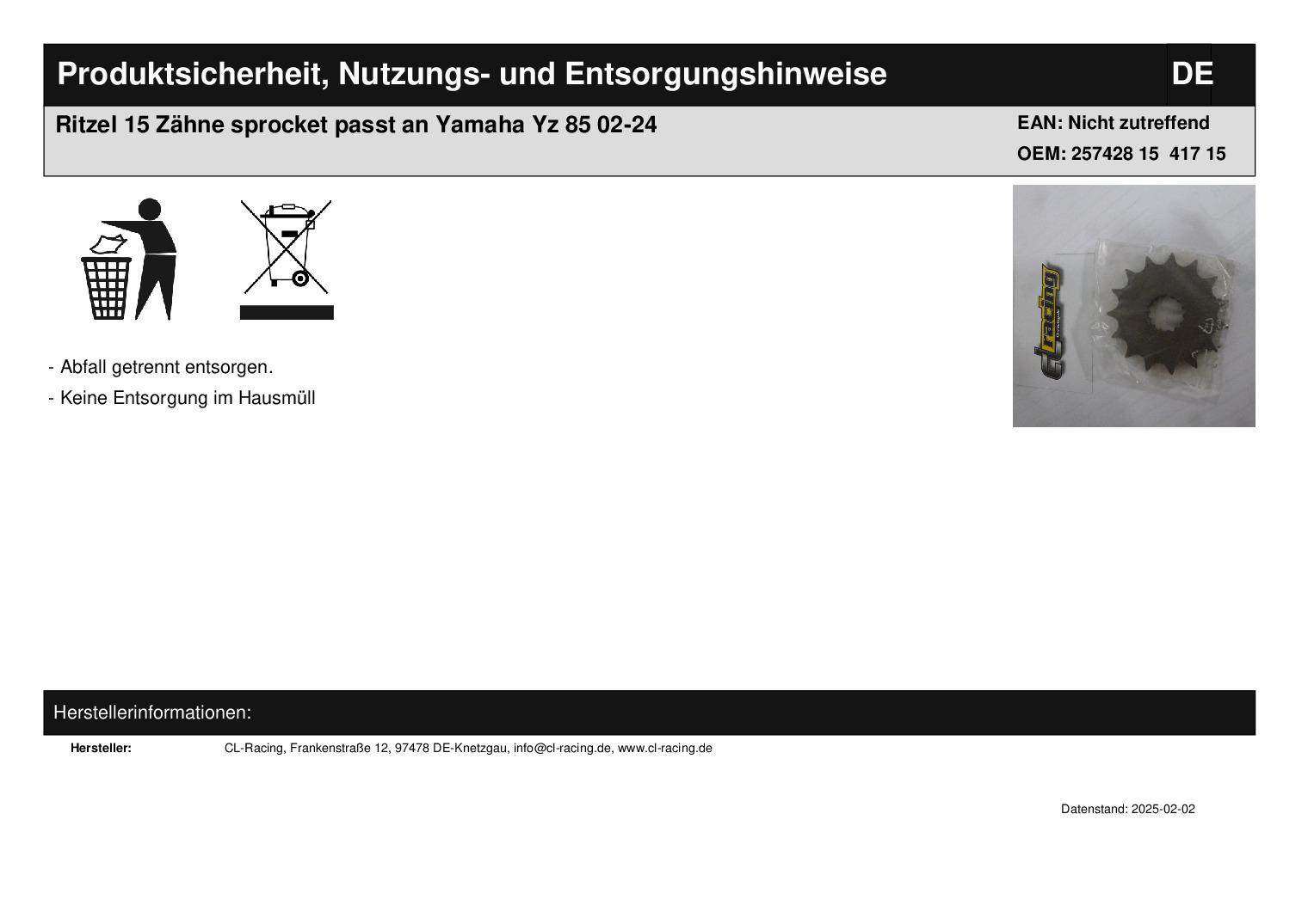 In dieser Auktion gibt es folgenden Artikel zu kaufen:    Ritzel   (siehe Foto)        Modell:   passend für Yamaha  YZ 85 Bj.: 2002 - 2024 Vor dem Kauf bitte Übersetzung mit Ihrem Fahrzeug vergleichen! Lieferumfang: 1 Stück     Artikelzustand:  neu