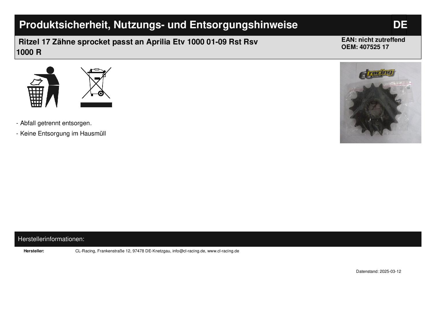 In dieser Auktion gibt es folgenden Artikel zu kaufen: Ritzel (siehe Foto) Modell: passend für Aprilia ETV 1000 Bj.: 2001 - 2009 RST 1000 Bj.: 2001 - 2004 RSV 1000 R Bj.: 2004 - 2009 RSV 1000 Bj.: 1998 - 2003 Vor dem Kauf bitte Übersetzung mit Ihrem Fahrzeug vergleichen! Lieferumfang: 1 Stück Artikelzustand: neu