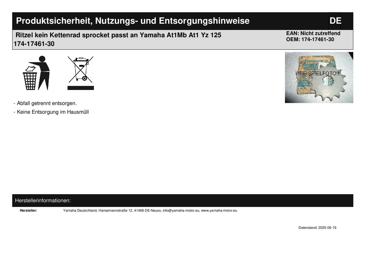 In dieser Auktion gibt es folgenden Artikel zu kaufen: originales Ritzel (ähnlich Foto) Modell: passend für Yamaha AT1MB 1970 YZ125 Bj.: 1974 - 1976 Zähnezahl: 13 Vor dem Kauf bitte Übersetzung mit Ihrem Fahrzeug vergleichen! Lieferumfang: 1 Stück Artikelzustand: neu aus Geschäftsauflösung, mit leichten Lagerspuren wie z. B. kleineren Kratzern oder etwas Flugrost; Zustand ähnlich Foto Bei Unklarheiten oder Fragen bitte erst E-Mail schreiben.